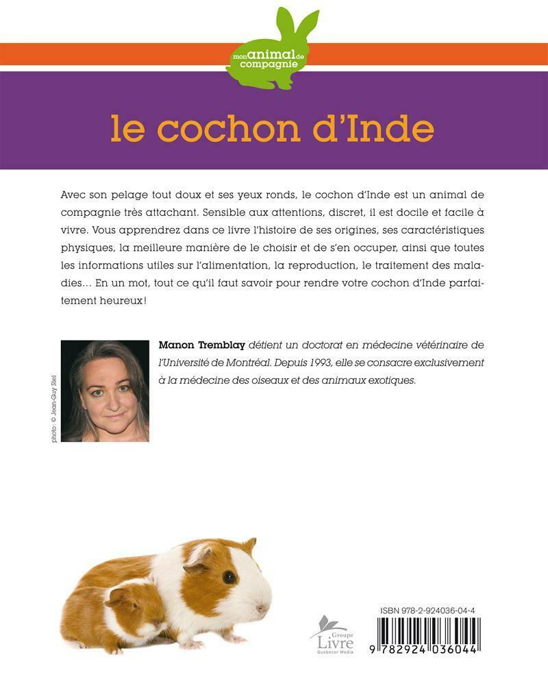 Avec son pelage tout doux et ses yeux ronds, le cochon d'Inde est un animal de compagnie très attachant. Sensible aux attentions, discret, il est docile et facile à vivre. Vous apprendrez dans ce livre l'histoire de ses origines, ses caractéristiques physiques, la meilleure manière de le choisir et de s'en occuper, ainsi que toutes les informations utiles sur l'alimentation, la reproduction, le traitement des maladies…En un mot, tout ce qu'il faut savoir pour rendre votre cochon d'Inde parfaitement heureux !