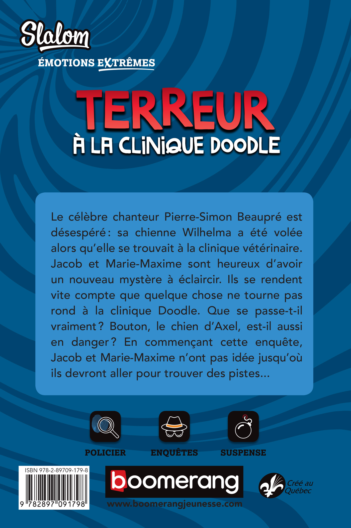 Le célèbre chanteur Pierre-Simon Beaupré est désespéré: sa chienne Wilhelma a été volée alors qu’elle se trouvait à la clinique vétérinaire.Jacob et Marie-Maxime sont heureux d’avoir un nouveau mystère à éclaircir. Ils se rendent vite compte que quelque chose ne tourne pas rond à la Clinique Doodle. Que se passe-t-il vraiment? Bouton, le chien d’Axel, est-il aussi en danger? En commençant cette enquête, Jacob et Marie-Maxime ignorent jusqu’où ils devront aller pour trouver des pistes...