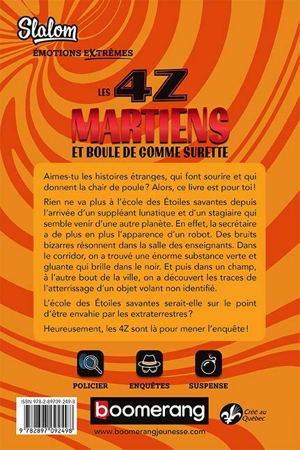 Aimes-tu les histoires étranges, qui font sourire et qui donnent la chair de poule? Alors, ce livre est pour toi!Rien ne va plus à l'école des Étoiles savantes depuis l'arrivée d'un suppléant lunatique et d'un stagiaire qui semble venir d'une autre planète. En effet, la secrétaire a de plus en plus l'apparence d'un robot. Des bruits bizarres résonnent dans la salle des enseignants. Dans le corridor, on a trouvé une énorme substance verte et gluante qui brille dans le noir. Et puis dans un champ, à l'autre bout de la ville, on a découvert les traces de l'atterrissage d'un objet volant non identifié.L'école des Étoiles savantes serait-elle sur le point d'être envahie par les extraterrestres?Heureusement, les 4Z sont là pour mener l'enquête!