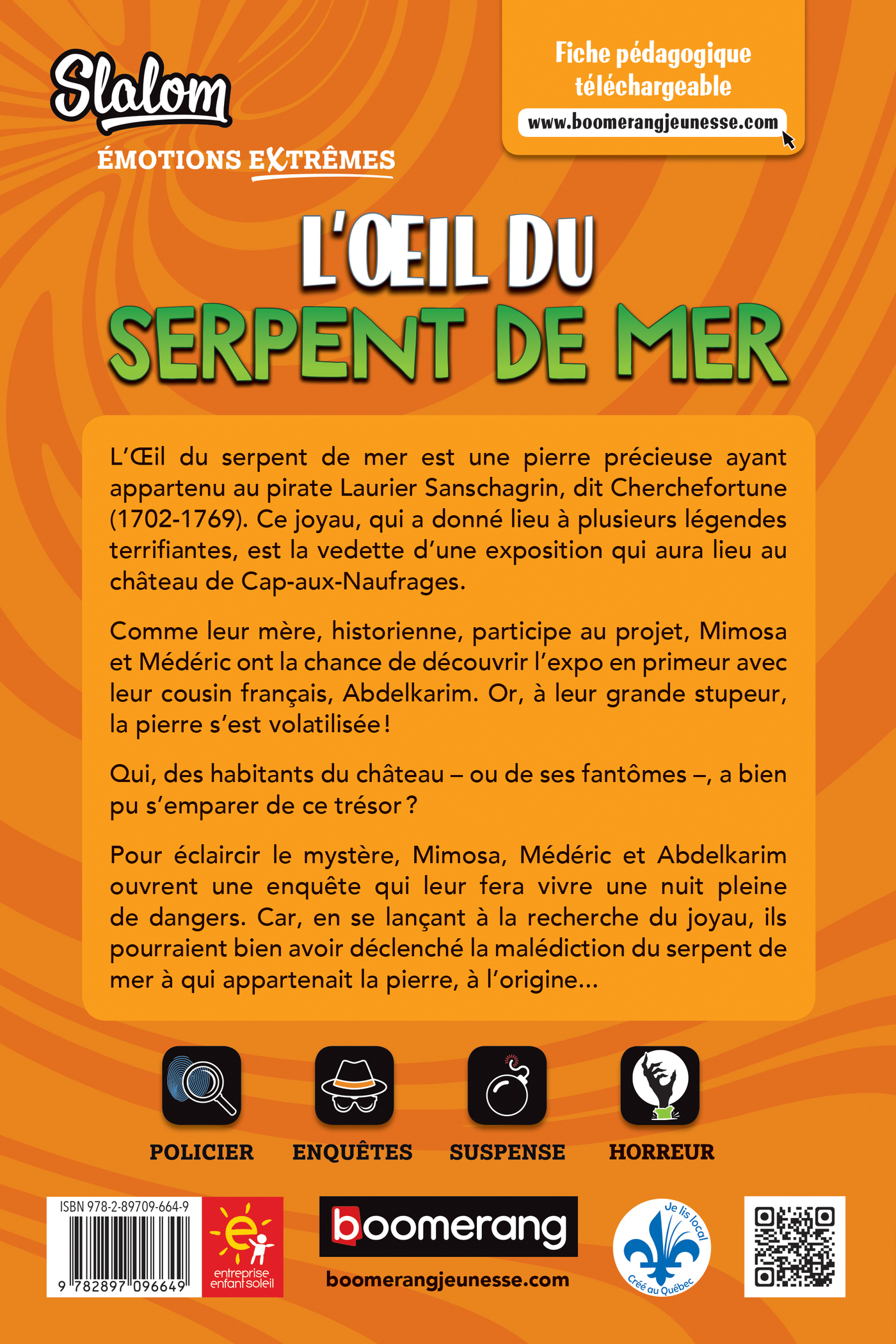L’Oeil du serpent de mer est une pierre précieuse ayant appartenu au pirate Laurier Sanschagrin, dit Cherchefortune (1702-1769). Ce joyau, qui a donné lieu à plusieurs légendes terrifiantes, est la vedette d’une exposition qui aura lieu au château de Cap-aux-Naufrages. Comme leur mère, historienne, participe au projet, Mimosa et Médéric ont la chance de découvrir l’expo en primeur avec leur cousin français, Abdelkarim. Or, à leur grande stupeur, la pierre s’est volatilisée ! Qui, des habitants du château – ou de ses fantômes –, a bien pu s’emparer de ce trésor ? Pour éclaircir le mystère, Mimosa, Médéric et Abdelkarim ouvrent une enquête qui leur fera vivre une nuit pleine de dangers. Car, en se lançant à la recherche du joyau, ils pourraient bien avoir déclenché la malédiction du serpent de mer à qui appartenait la pierre, à l’origine...