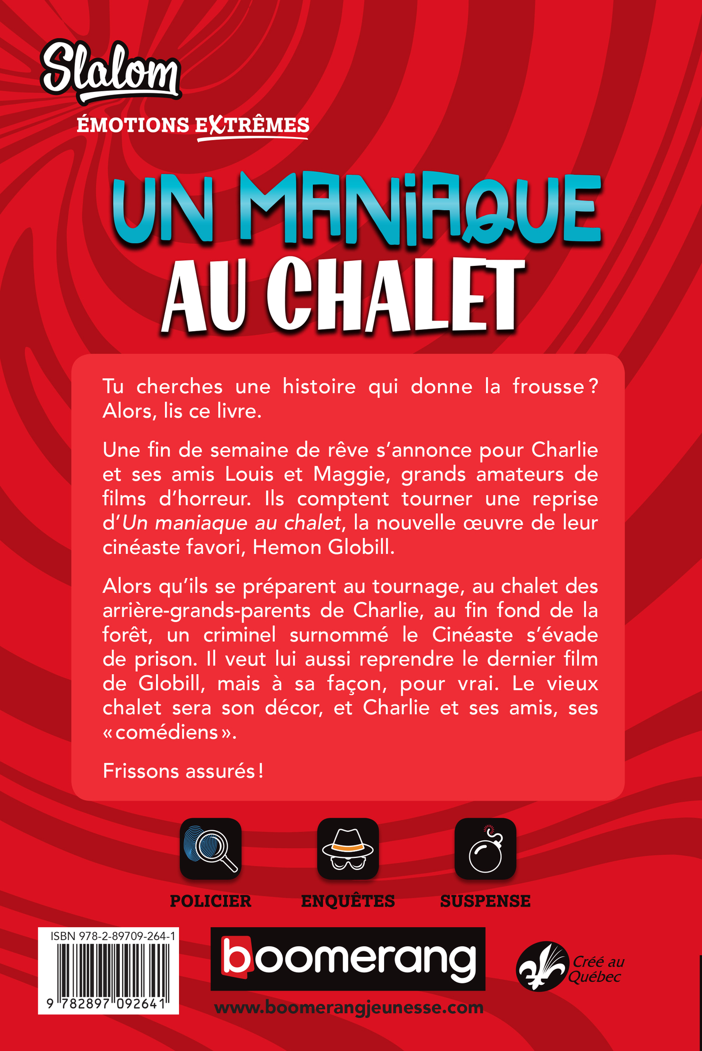 Tu cherches une histoire qui donne la frousse ? Alors, lis ce livre. Une fin de semaine de rêve s’annonce pour Charlie et ses amis Louis et Maggie, grands amateurs de films d’horreur. Ils comptent tourner une reprise d’Un maniaque au chalet, la nouvelle œuvre de leur cinéaste favori, Hemon Globill. Alors qu’ils se préparent au tournage, au chalet des arrière-grands-parents de Charlie, au fin fond de la forêt, un criminel surnommé le Cinéaste s’évade de prison. Il veut lui aussi reprendre le dernier film de Globill, mais à sa façon, pour vrai. Le vieux chalet sera son décor, et Charlie et ses amis, ses "comédiens". Frissons assurés!