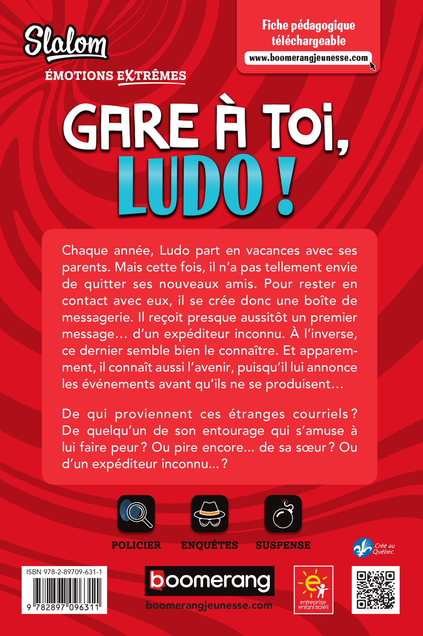 Chaque année, Ludo part en vacances avec ses parents. Mais cette fois, il n’a pas tellement envie de quitter ses nouveaux amis. Pour rester en contact avec eux, il se crée donc une boîte de messagerie. Il reçoit presque aussitôt un premier message… d’un expéditeur inconnu. À l’inverse, ce dernier semble bien le connaître. Et apparemment, il connaît aussi l’avenir, puisqu’il lui annonce les événements avant qu’ils ne se produisent…De qui proviennent ces étranges courriels ? De quelqu’un de son entourage qui s’amuse à lui faire peur? Ou pire encore… de sa sœur? ou d’un expéditeur inconnu…?