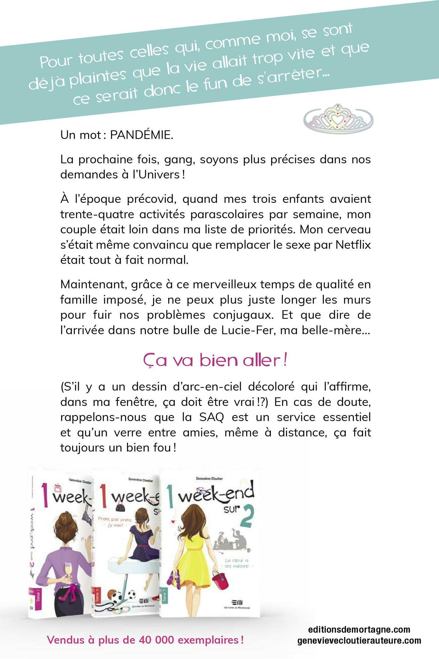 Pour toutes celles qui, comme moi, se sont déjà plaintes que la vie allait trop vite et que ce serait donc le fun de s’arrêter… Un mot : PANDÉMIE. La prochaine fois, gang, soyons plus précises dans nos demandes à l’Univers ! À l’époque précovid, quand mes trois enfants avaient trente-quatre activités parascolaires par semaine, mon couple était loin dans ma liste de priorités. Mon cerveau s’était même convaincu que remplacer le sexe par Netflix était tout à fait normal. Maintenant, grâce à ce merveilleux temps de qualité en famille imposé, je ne peux plus juste longer les murs pour fuir nos problèmes conjugaux. Et que dire de l’arrivée dans notre bulle de Lucie-Fer, ma belle-mère...Ça va bien aller ! (S’il y a un dessin d’arc-en-ciel décoloré qui l’affirme, dans ma fenêtre, ça doit être vrai !?) En cas de doute, rappelons-nous que la SAQ est un service essentiel et qu’un verre entre amies, même à distance, ça fait toujours un bien fou !