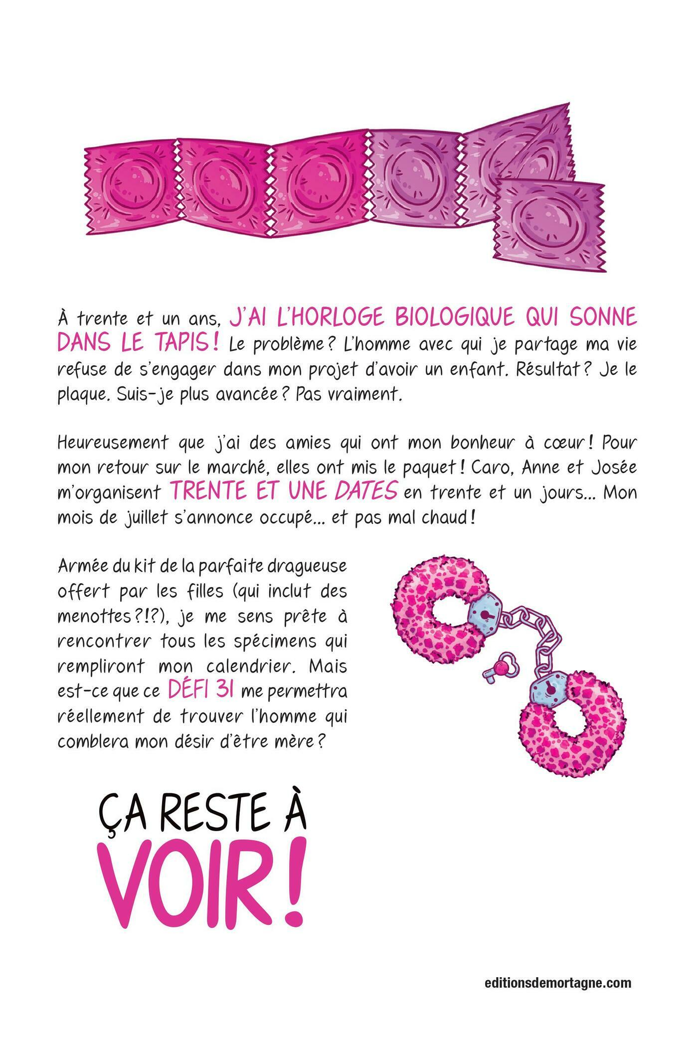À trente et un ans, j’ai l’horloge biologique qui sonne dans le tapis ! Le problème ? L’homme avec qui je partage ma vie refuse de s’engager dans mon projet d’avoir un enfant. Résultat ? Je le plaque. Suis-je plus avancée ? Pas vraiment.Heureusement que j’ai des amies qui ont mon bonheur à cœur ! Pour mon retour sur le marché, elles ont mis le paquet ! Caro, Anne et Josée m’organisent trente et une dates en trente et un jours… Mon mois de juillet s’annonce occupé… et pas mal chaud ! Armée du kit de la parfaite dragueuse offert par les filles (qui inclut des menottes ?!?), je me sens prête à rencontrer tous les spécimens qui rempliront mon calendrier. Mais est-ce que ce Défi 31 me permettra réellement de trouver l’homme qui comblera mon désir d’être mère ? Ça reste à voir !