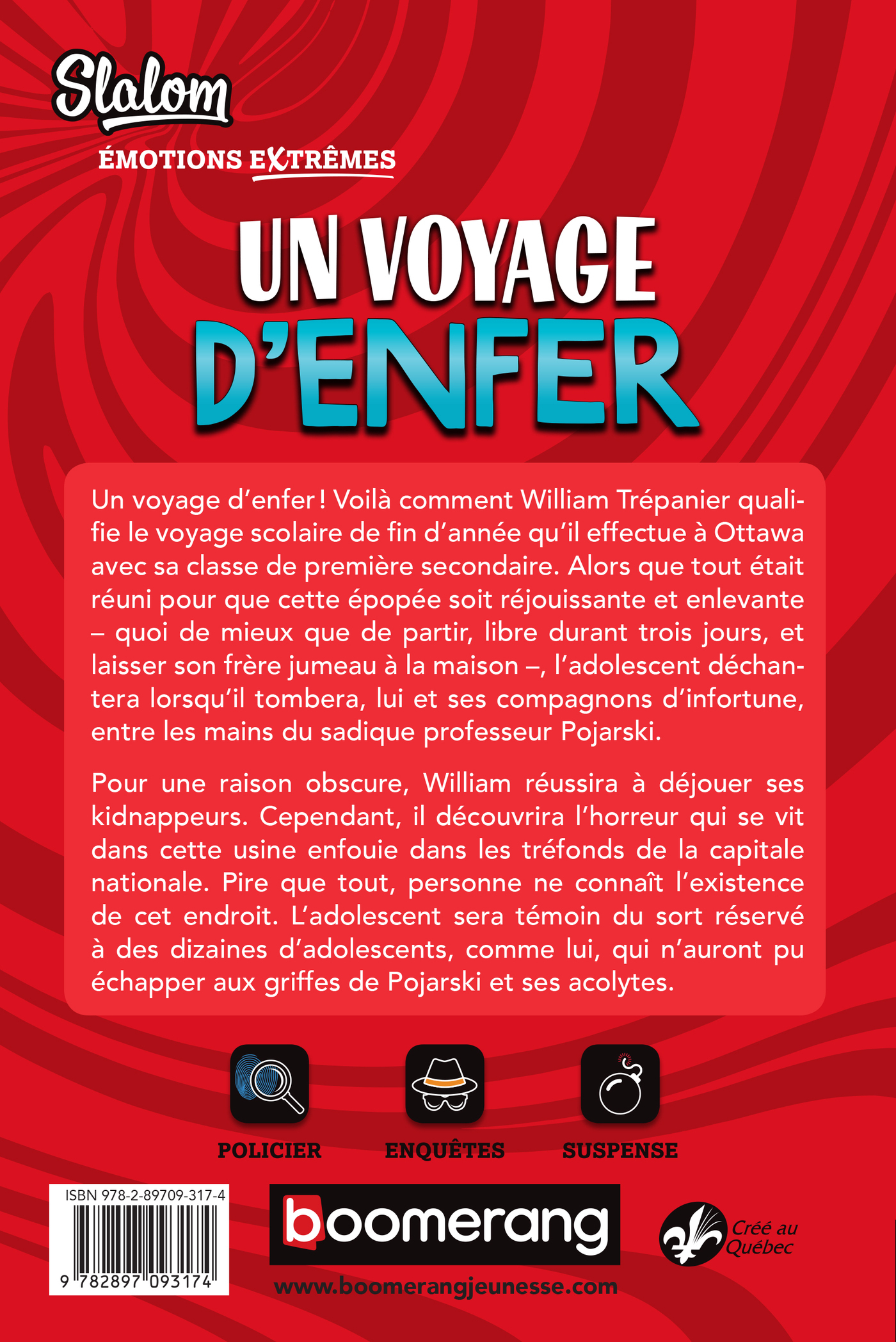 Un voyage d’enfer ! Voilà comment William Trépanier qualifie le voyage scolaire de fin d’année qu’il effectue à Ottawa avec sa classe de première secondaire. Alors que tout était réuni pour que cette épopée soit réjouissante et enlevante – quoi de mieux que de partir, libre durant trois jours, et laisser son frère jumeau à la maison – l’adolescent déchantera lorsqu’il tombera, lui et ses compagnons d’infortune, entre les mains du sadique professeur Pojarski. Pour une raison obscure, William réussira à déjouer ses kidnappeurs. Cependant, il découvrira l’horreur qui se vit dans cette usine enfouie dans les tréfonds de la capitale nationale. Pire que tout, personne ne connaît l’existence de cet endroit. L’adolescent sera témoin du sort réservé à des dizaines d’adolescents, comme lui, qui n’auront pu échapper aux griffes de Pojarski et ses acolytes.