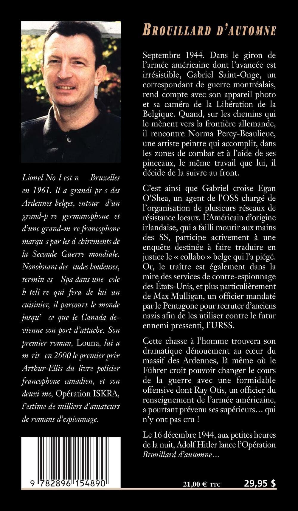 Septembre 1944. Dans le giron de l’armée américaine dont l’avancée est irrésistible, Gabriel Saint-Onge, un correspondant de guerre montréalais, rend compte avec son appareil photo et sa caméra de la Libération de la Belgique. Quand, sur les chemins qui le mènent vers la frontière allemande, il rencontre Norma Percy-Beaulieue, une artiste peintre qui accomplit, dans les zones de combat et à l’aide de ses pinceaux, le même travail que lui, il décide de la suivre au front. C’est ainsi que Gabriel croise Egan O’Shea, un agent de l’OSS chargé de l’organisation de plusieurs réseaux de résistance locaux. L’Américain d’origine irlandaise, qui a failli mourir aux mains des SS, participe activement à une enquête destinée à faire traduire en justice le « collabo » belge qui l’a piégé. Or, le traître est également dans la mire des services de contre-espionnage des États-Unis, et plus particulièrement de Max Mulligan, un officier mandaté par le Pentagone pour recruter d’anciens nazis afin de les utiliser contre le futur ennemi pressenti, l’URSS. Cette chasse à l’homme trouvera son dramatique dénouement au cœur du massif des Ardennes, là même où le Führer croit pouvoir changer le cours de la guerre avec une formidable offensive dont Ray Otis, un officier du renseignement de l’armée américaine, a pourtant prévenu ses supérieurs… qui n’y ont pas cru !Le 16 décembre 1944, aux petites heures de la nuit, Adolf Hitler lance l’Opération « Brouillard d’automne »…