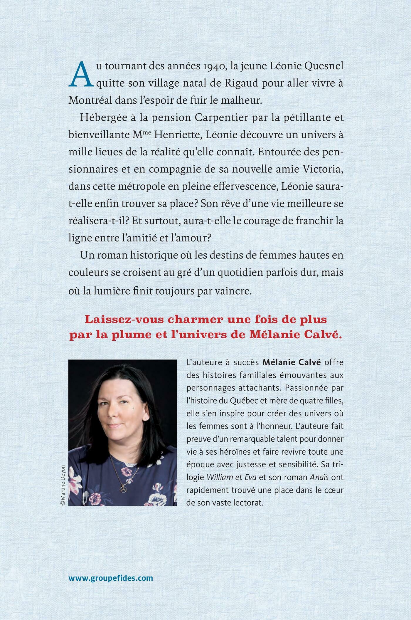 Au tournant des années 1940, la jeune Léonie Quesnel quitte son village natal de Rigaud pour aller vivre à Montréal dans l’espoir de fuir le malheur. Hébergée à la pension Carpentier par la pétillante et bienveillante Mme Henriette, Léonie découvre un univers à mille lieues de la réalité qu’elle connaît. Entourée des pensionnaires et en compagnie de sa nouvelle amie Victoria, dans cette métropole en pleine effervescence, Léonie saurat-elle enfin trouver sa place ? Son rêve d’une vie meilleure se réalisera-t-il ? Et surtout, aura-t-elle le courage de franchir la ligne entre l’amitié et l’amour ?Un roman historique où les destins de femmes hautes en couleurs se croisent au gré d’un quotidien parfois dur, mais où la lumière finit toujours par vaincre.Laissez-vous charmer une fois de plus par la plume et l’univers de Mélanie Calvé.