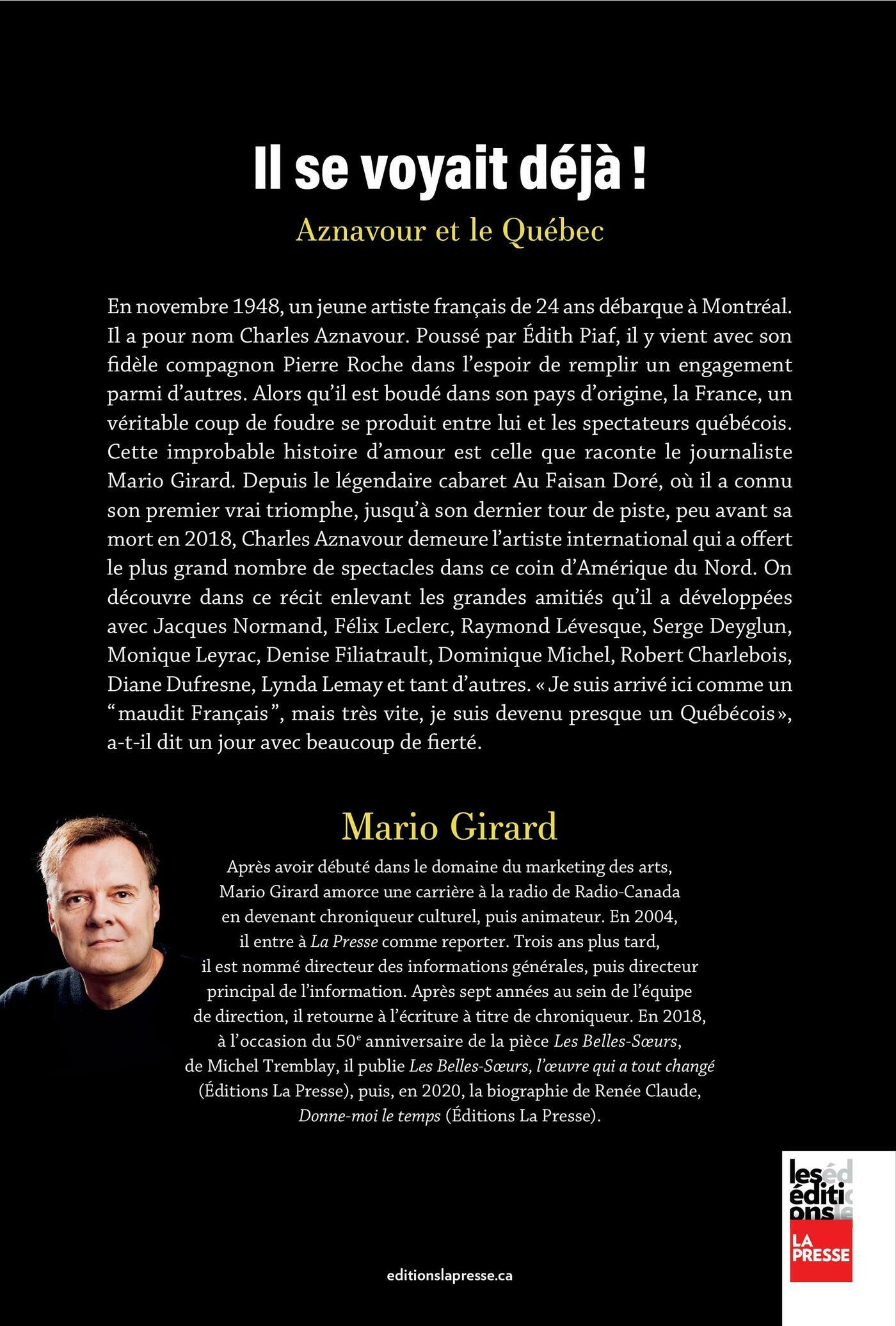 En novembre 1948, un jeune artiste français de 24 ans débarque à Montréal. Il a pour nom Charles Aznavour. Poussé par Édith Piaf, il y vient avec son fidèle compagnon Pierre Roche dans l’espoir de remplir un engagement parmi d’autres. Alors qu’il est boudé dans son pays d’origine, la France, un véritable coup de foudre se produit entre lui et les spectateurs québécois. Cette improbable histoire d’amour est celle que raconte le journaliste Mario Girard. Depuis le légendaire cabaret Au Faisan Doré, où il a connu son premier vrai triomphe, jusqu’à son dernier tour de piste, peu avant sa mort en 2018, Charles Aznavour demeure l’artiste international qui a offert le plus grand nombre de spectacles dans ce coin d’Amérique du Nord. On découvre dans ce récit enlevant les grandes amitiés qu’il a développées avec Jacques Normand, Félix Leclerc, Raymond Lévesque, Serge Deyglun, Monique Leyrac, Denise Filiatrault, Dominique Michel, Robert Charlebois, Diane Dufresne, Lynda Lemay et tant d’autres. « Je suis arrivé ici comme un “maudit Français”, mais très vite, je suis devenu presque un Québécois», a-t-il dit un jour avec beaucoup de fierté.