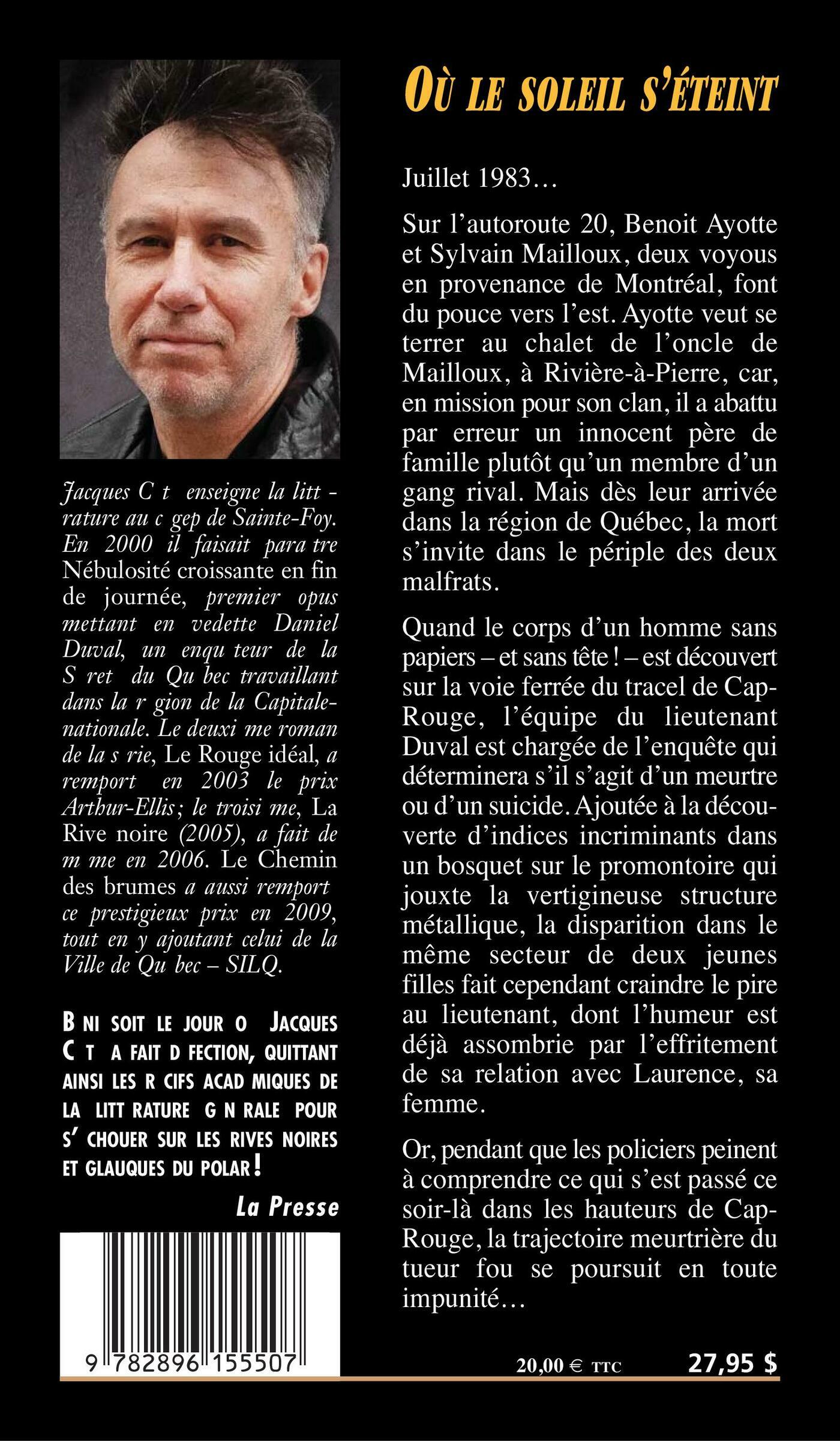 Juillet 1983…Sur l’autoroute 20, Benoit Ayotte et Sylvain Mailloux, deux voyous en provenance de Montréal, font du pouce vers l’est. Ayotte veut se terrer au chalet de l’oncle de Mailloux, à Rivière-à-Pierre, car, en mission pour son clan, il a abattu par erreur un innocent père de famille plutôt qu’un membre d’un gang rival. Mais dès leur arrivée dans la région de Québec, la mort s’invite dans le périple des deux malfrats.Quand le corps d’un homme sans papiers – et sans tête ! – est découvert sur la voie ferrée du tracel de Cap-Rouge, l’équipe du lieutenant Duval est chargée de l’enquête qui déterminera s’il s’agit d’un meurtre ou d’un suicide. Ajoutée à la découverte d’indices incriminants dans un bosquet sur le promontoire qui jouxte la vertigineuse structure métallique, la disparition dans le même secteur de deux jeunes filles fait cependant craindre le pire au lieutenant, dont l’humeur est déjà assombrie par l’effritement de sa relation avec Laurence, sa femme.Or, pendant que les policiers peinent à comprendre ce qui s’est passé ce soir-là dans les hauteurs de Cap-Rouge, la trajectoire meurtrière du tueur fou se poursuit en toute impunité…