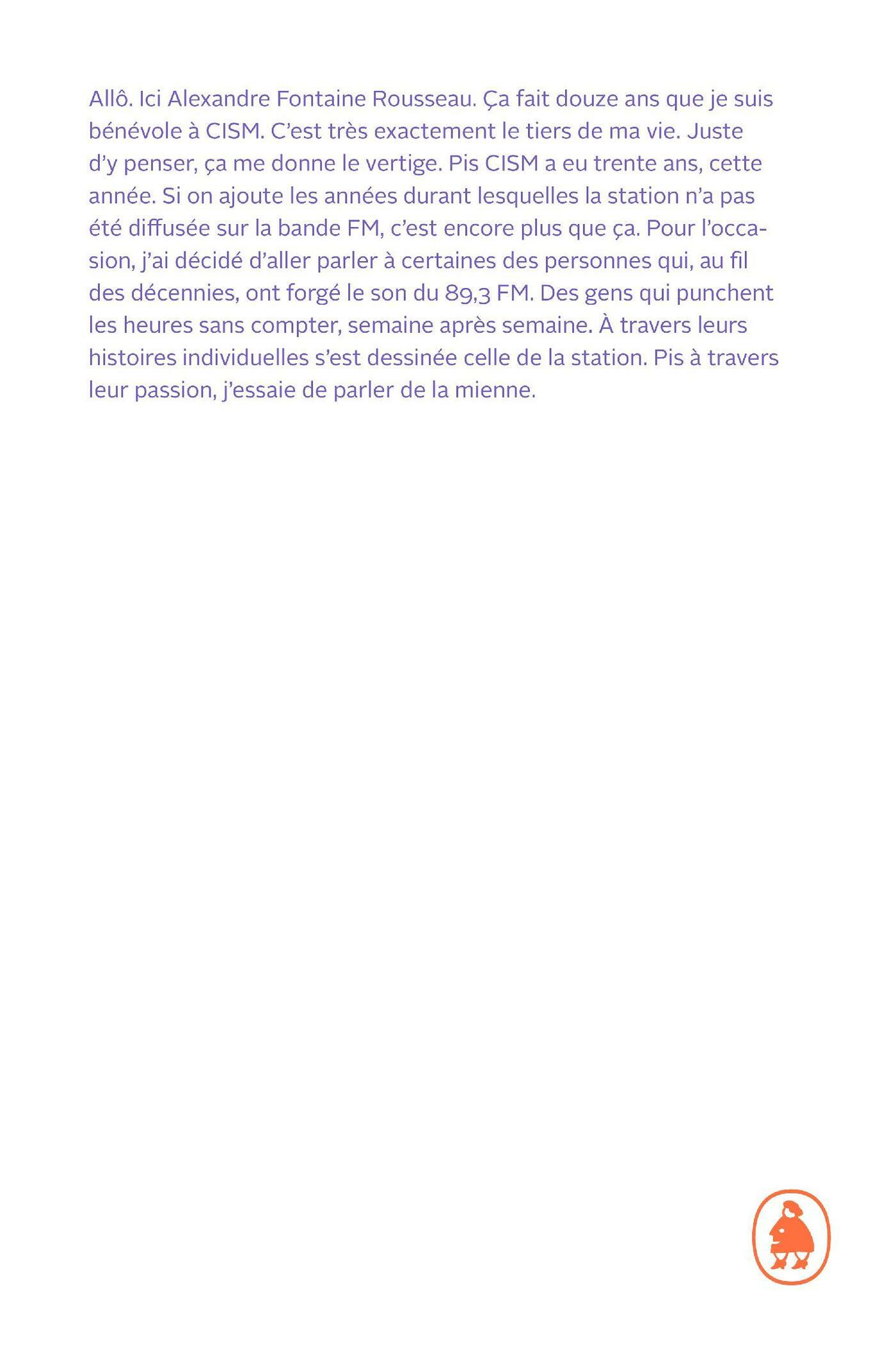 Allô. Ici Alexandre Fontaine Rousseau. Ça fait douze ans que je suis bénévole à CISM. C’est très exactement le tiers de ma vie. Juste d’y penser, ça me donne le vertige. Pis CISM a eu trente ans, cette année. Si on ajoute les années durant lesquelles la station n’a pas été diffusée sur la bande FM, c’est encore plus que ça. Pour l’occasion, j’ai décidé d’aller parler à certaines des personnes qui, au fil des décennies, ont forgé le son du 89,3 FM. Des gens qui punchent les heures sans compter, semaine après semaine. À travers leurs histoires individuelles s’est dessinée celle de la station. Pis à travers leur passion, j’essaie de parler de la mienne.