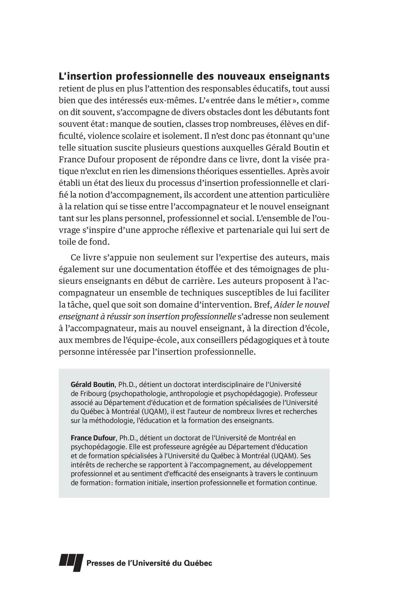L’insertion professionnelle des nouveaux enseignants retient de plus en plus l’attention des responsables éducatifs, tout aussi bien que des intéressés eux-mêmes. L’« entrée dans le métier », comme on dit souvent, s’accompagne de divers obstacles dont les débutants font souvent état : manque de soutien, classes trop nombreuses, élèves en difficulté, violence scolaire et isolement. Il n’est donc pas étonnant qu’une telle situation suscite plusieurs questions auxquelles Gérald Boutin et France Dufour proposent de répondre dans ce livre, dont la visée pratique n’exclut en rien les dimensions théoriques essentielles. Après avoir établi un état des lieux du processus d’insertion professionnelle et clarifié la notion d’accompagnement, ils accordent une attention particulière à la relation qui se tisse entre l’accompagnateur et le nouvel enseignant tant sur les plans personnel, professionnel et social. L’ensemble de l’ouvrage s’inspire d’une approche réflexive et partenariale qui lui sert de toile de fond.Ce livre s’appuie non seulement sur l’expertise des auteurs, mais également sur une documentation étoffée et des témoignages de plusieurs enseignants en début de carrière. Les auteurs proposent à l’accompagnateur un ensemble de techniques susceptibles de lui faciliter la tâche, quel que soit son domaine d’intervention. Bref, Aider le nouvel enseignant à réussir son insertion professionnelle s’adresse non seulement à l’accompagnateur, mais au nouvel enseignant, à la direction d’école, aux membres de l’équipe-école, aux conseillers pédagogiques et à toute personne intéressée par l’insertion professionnelle.Gérald Boutin, Ph.D., détient un doctorat interdisciplinaire de l’Université de Fribourg (psychopathologie, anthropologie et psychopédagogie). Professeur associé au Département d’éducation et de formation spécialisées de l’Université du Québec à Montréal (UQAM), il est l’auteur de nombreux livres et recherches sur la méthodologie, l’éducation et la formation des enseignants.France Dufour, Ph.D., détient un doctorat de l’Université de Montréal en psychopédagogie. Elle est professeure agrégée au Département d’éducation et de formation spécialisées à l’Université du Québec à Montréal (UQAM). Ses intérêts de recherche se rapportent à l’accompagnement, au développement professionnel et au sentiment d’efficacité des enseignants à travers le continuum de formation : formation initiale, insertion professionnelle et formation continue.