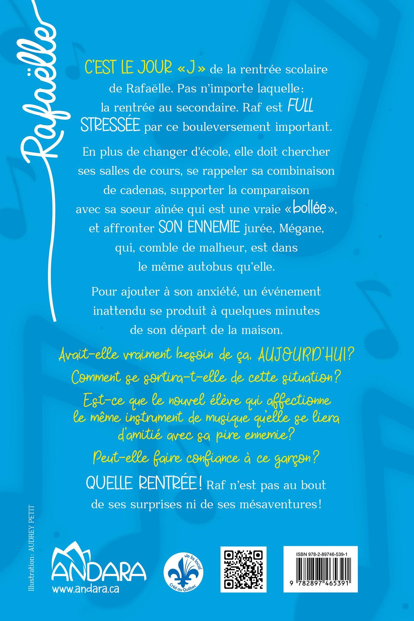 C’EST LE JOUR « J » de la rentrée scolaire de Rafaëlle. Pas n’importe laquelle : la rentrée au secondaire. Raf est FULL STRESSÉE par ce bouleversement important. En plus de changer d'école, elle doit chercher ses salles de cours, se rappeler sa combinaison de cadenas, supporter la comparaison avec sa soeur aînée qui est une vraie « bollée », et affronter SON ENNEMIE jurée, Mégane, qui, comble de malheur, est dans le même autobus qu’elle. Pour ajouter à son anxiété, un événement inattendu se produit à quelques minutes de son départ de la maison. Avait-elle vraiment besoin de ça, AUJOURD’HUI ? Comment se sortira-t-elle de cette situation ?