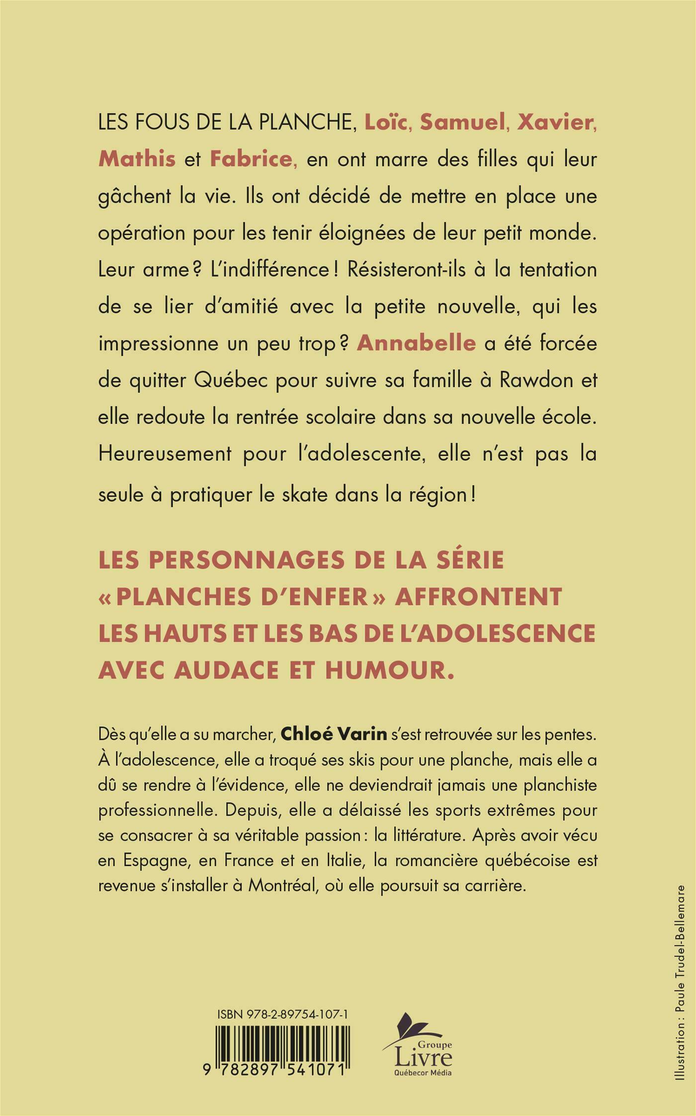 Les fous de la planche, Loïc, Samuel, Xavier, Mathis et Fabrice, en ont marre des filles qui leur gâchent la vie. Ils ont décidé de mettre en place une opération pour les tenir éloignées de leur petit monde. Leur arme? L'indifférence! Résisteront-ils à la tentation de se lier d'amitié avec la petite nouvelle, qui les impressionne un peu trop? . .Annabelle a été forcée de quitter Québec pour suivre sa famille à Rawdon et elle redoute la rentrée scolaire dans sa nouvelle école. Heureusement pour l'adolescente, elle n'est pas la seule à pratiquer le skate dans la région! . . Les personnages de la série «Planches d'enfer» affrontent les hauts et les bas de l'adolescence avec AUDACE et HUMOUR.