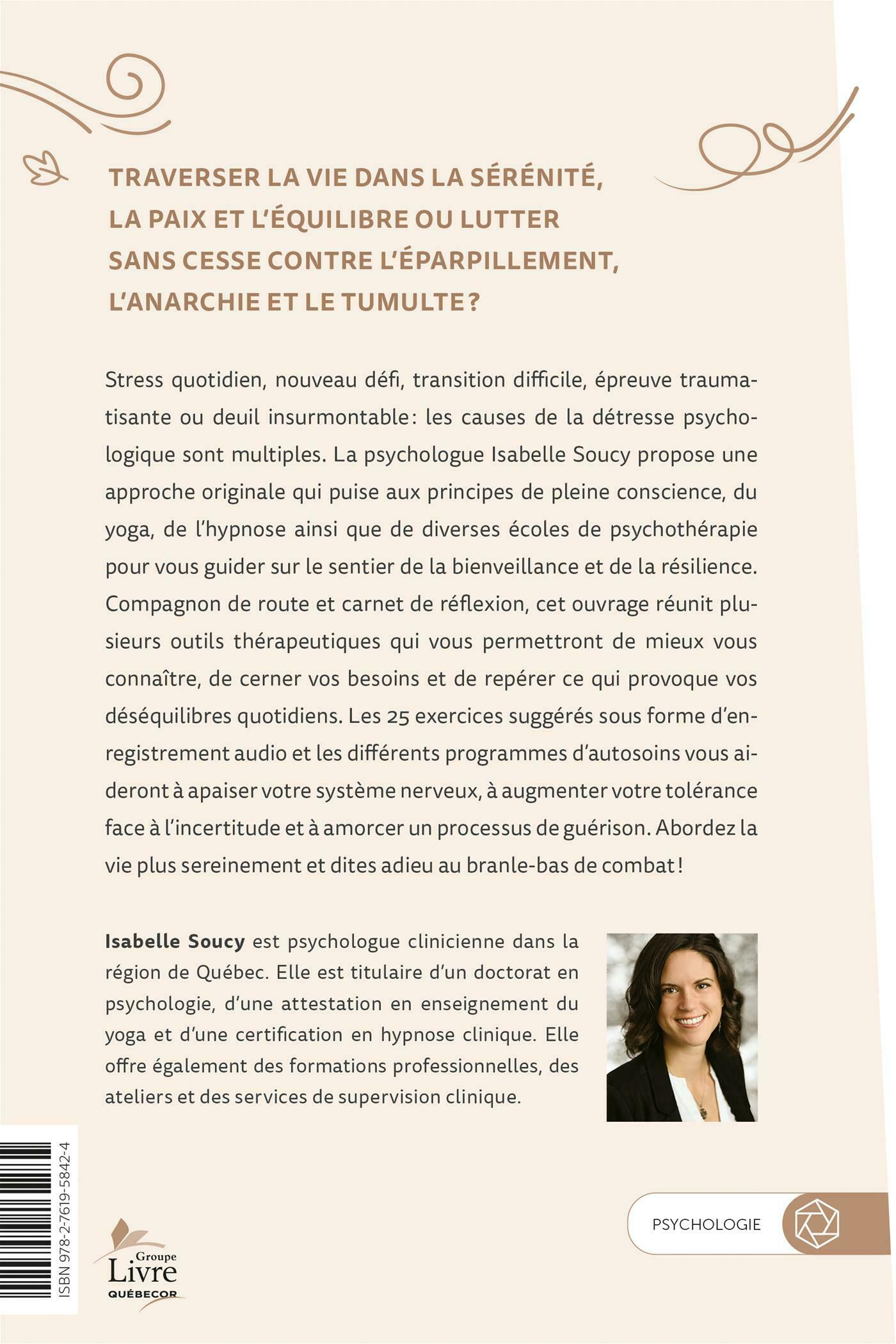 Stress quotidien, nouveau défi, transition difficile, épreuve traumatisante ou deuil insurmontable: les causes de la détresse psychologique sont multiples. La psychologue Isabelle Soucy propose une approche originale qui puise aux principes de pleine conscience, du yoga, de l'hypnose ainsi que de diverses écoles de psychothérapie pour vous guider sur le sentier de la bienveillance et de la résilience.