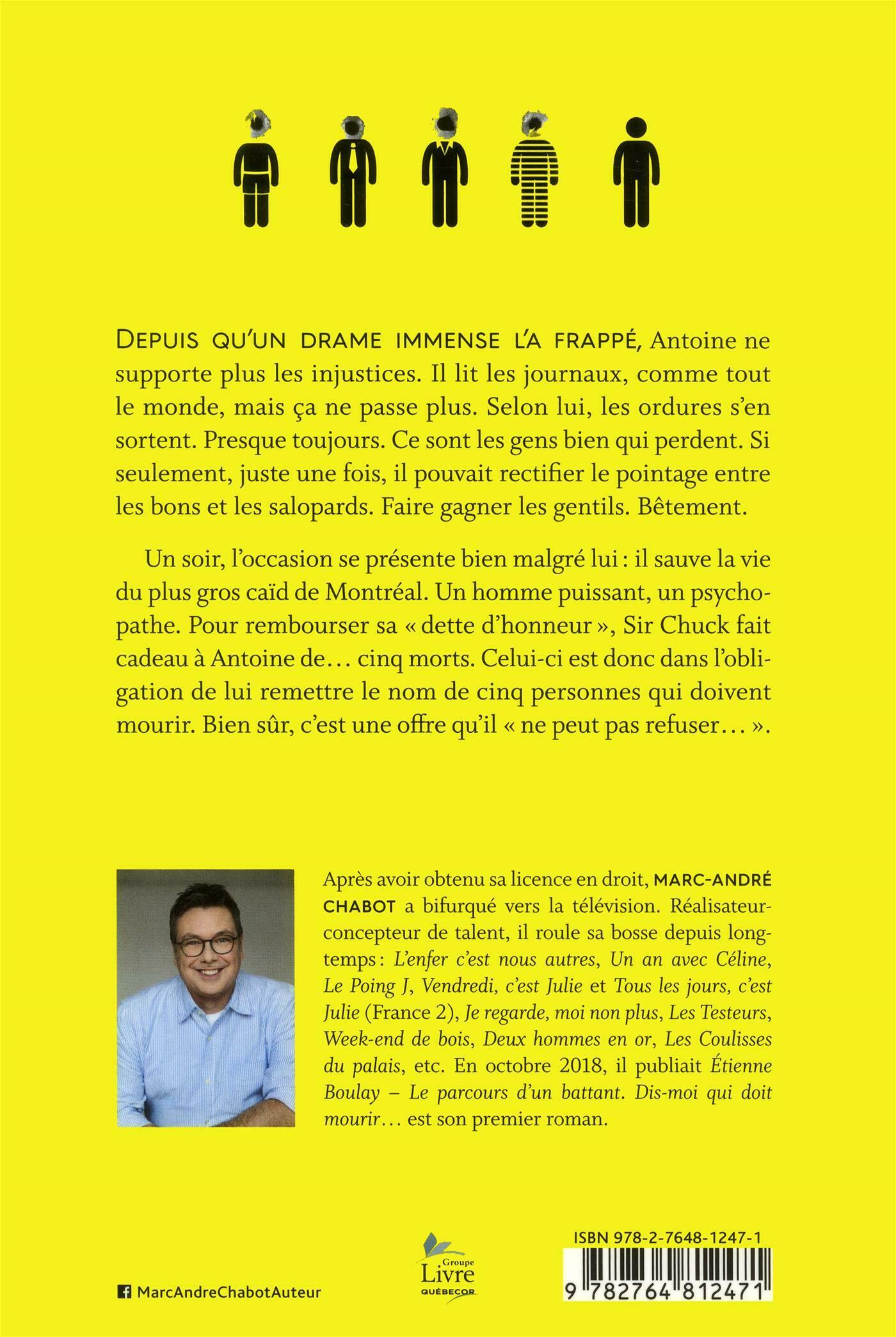 . .Depuis qu'un drame immense l'a frappé, Antoine ne supporte plus les injustices. Il lit les journaux, comme tout le monde, mais ça ne passe plus. Selon lui, les ordures s'en sortent. Presque toujours. Ce sont les gens bien qui perdent. Si seulement, juste une fois, il pouvait rectifier le pointage entre les bons et les salopards. Faire gagner les gentils. Bêtement.. .. .Un soir, l'occasion se présente bien malgré lui : il sauve la vie du plus gros caïd de Montréal. Un homme puissant, un psychopathe. Pour rembourser sa « dette d'honneur », Sir Chuck fait cadeau à Antoine de… cinq morts. Celui-ci est donc dans l'obligation de lui remettre le nom de cinq personnes qui doivent mourir. Bien sûr, c'est une offre qu'il « ne peut pas refuser… ».