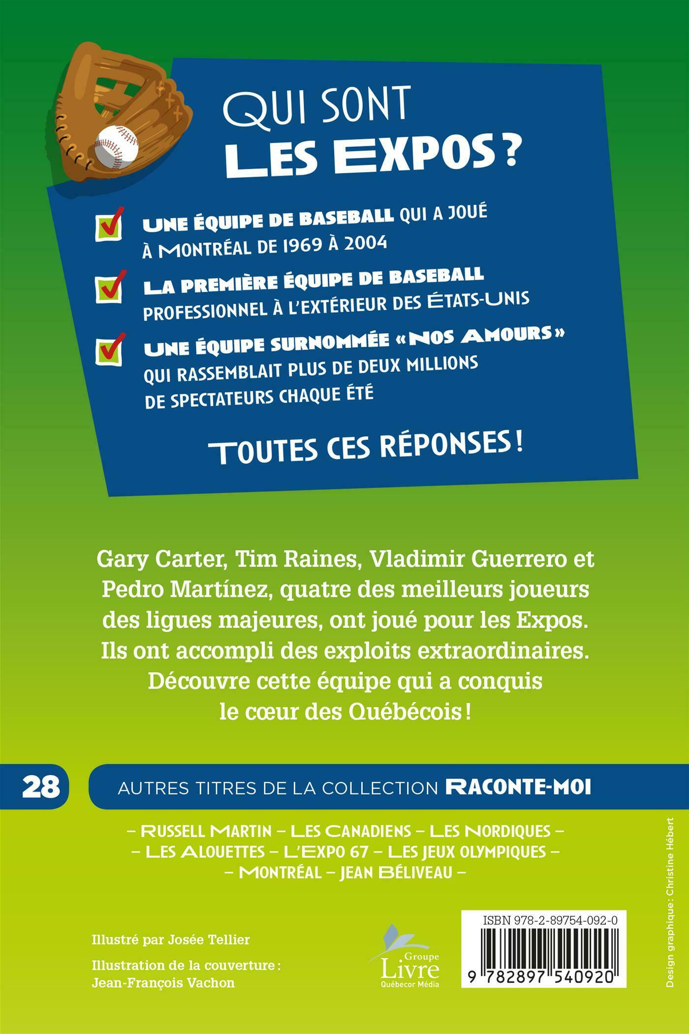 Qui sont les Expos? . • Une équipe de baseball qui a joué à Montréal de 1969 à 2004 .• La première équipe de baseball professionnel à l'extérieur des États-Unis .• Une équipe surnommée «Nos Amours» qui rassemblait plus de deux millions .de spectateurs chaque été . . Gary Carter, Tim Raines, Vladimir Guerrero et Pedro Martínez, quatre des meilleurs joueurs des ligues majeures, ont joué pour les Expos. Ils ont accompli des exploits extraordinaires. Découvre cette équipe qui a conquis le cœur des Québécois!
