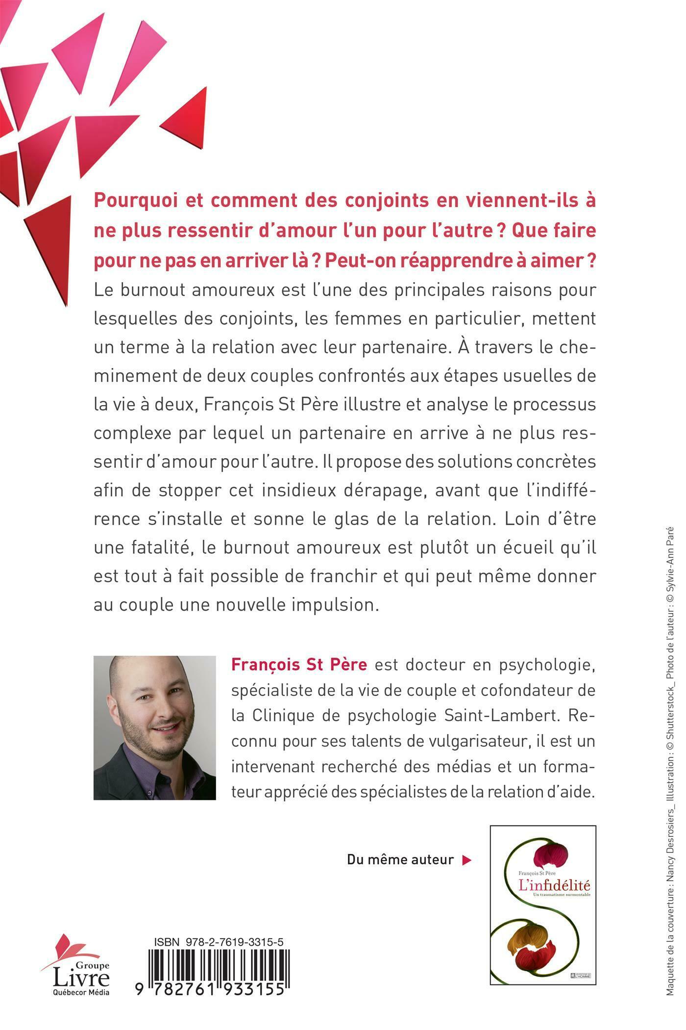 Pourquoi et comment des conjoints en viennent-ils à ne plus ressentir d'amour l'un pour l'autre? Que faire pour ne pas en arriver là? Peut-on réapprendre à aimer? Le burnout amoureux est l'une des principales raisons pour lesquelles des conjoints, les femmes en particulier, mettent un terme à la relation avec leur partenaire. À travers le cheminement de deux couples confrontés aux étapes usuelles de la vie à deux, François St Père illustre et analyse le processus complexe par lequel un partenaire en arrive à ne plus ressentir d'amour pour l'autre. Il propose des solutions concrètes afin de stopper cet insidieux dérapage, avant que l'indifférence s'installe et sonne le glas de la relation. Loin d'être une fatalité, le burnout amoureux est plutôt un écueil qu'il est tout à fait possible de franchir et qui peut même donner au couple une nouvelle impulsion.