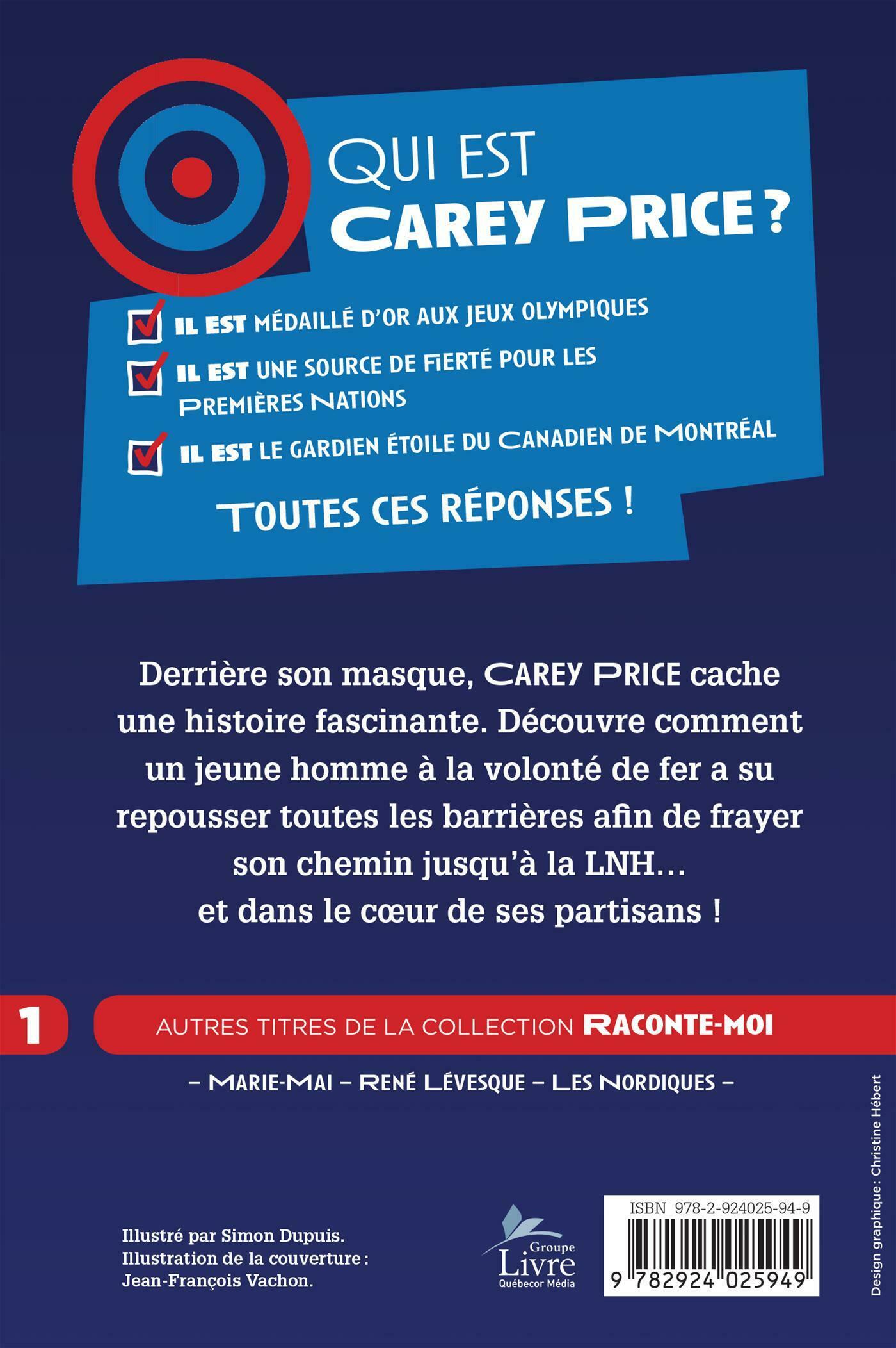 Qui est Carey Price? . .- Il est médaillé d'or aux Jeux olympiques .- Il est une source de fierté pour les Premières Nations .- Il est le gardien étoile du Canadien de Montréal . .Derrière son masque, Carey Price cache une histoire fascinante. Découvre comment un jeune homme à la volonté de fer a su repousser toutes les barrières afin de frayer son chemin jusqu'à la LNH… et dans le cœur de ses partisans !