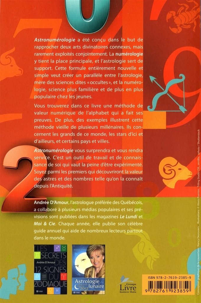 Astronumérologie a été conçu dans le but de rapprocher deux arts divinatoires connexes, mais rarement exploités conjointement. La numérologie y tient la place principale, et l’astrologie sert de support. Cette formule entièrement nouvelle et simple veut créer un parallèle entre l’astrologie, mère des sciences dites «occultes», et la numérologie, science plus familière et de plus en plus populaire chez les jeunes. Vous trouverez dans ce livre une méthode de valeur numérique de l’alphabet qui a fait ses preuves. De plus, des exemples illustrent cette méthode vieille de plusieurs millénaires. Ils concernent les grands de ce monde, les stars d’ici et d’ailleurs, et certains pays et villes. Astronumérologie vous surprendra et vous rendra service. C’est un outil de travail et de connaissance de soi qui vaut la peine d’être expérimenté. Soyez parmi les premiers qui découvriront la valeur des astres et des nombres telle qu’on la connaît depuis l’Antiquité.