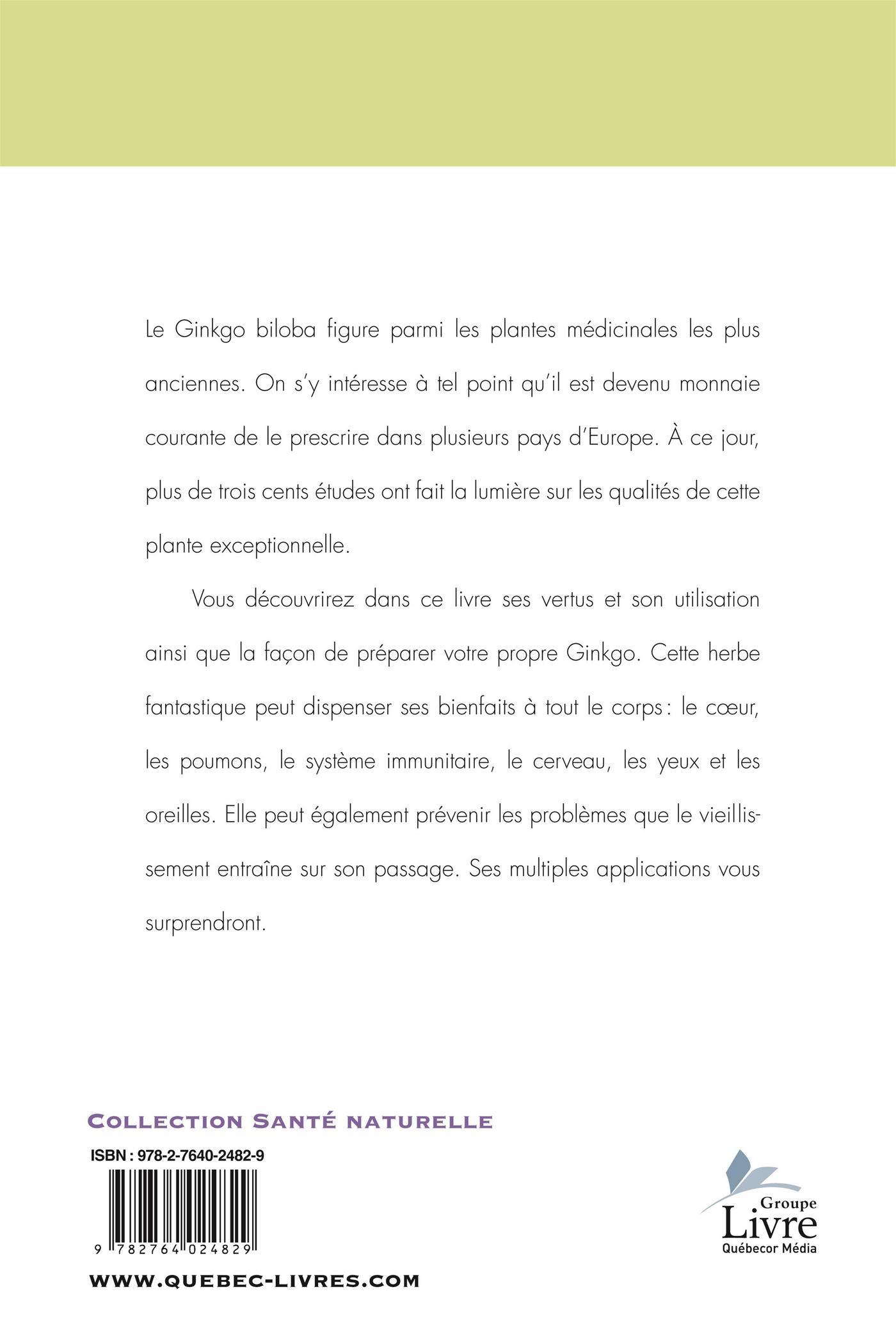 Vous découvrirez dans ce livre ses vertus et son utilisation ainsi que la façon de préparer votre propre Ginkgo. Cette herbe fantastique peut dispenser ses bienfaits à tout le corps : le cœur, les poumons, le système immunitaire, le cerveau, les yeux et les oreilles. Elle peut également prévenir les problèmes que le vieil-lis-sement entraîne sur son passage. Ses multiples applications vous surprendront.