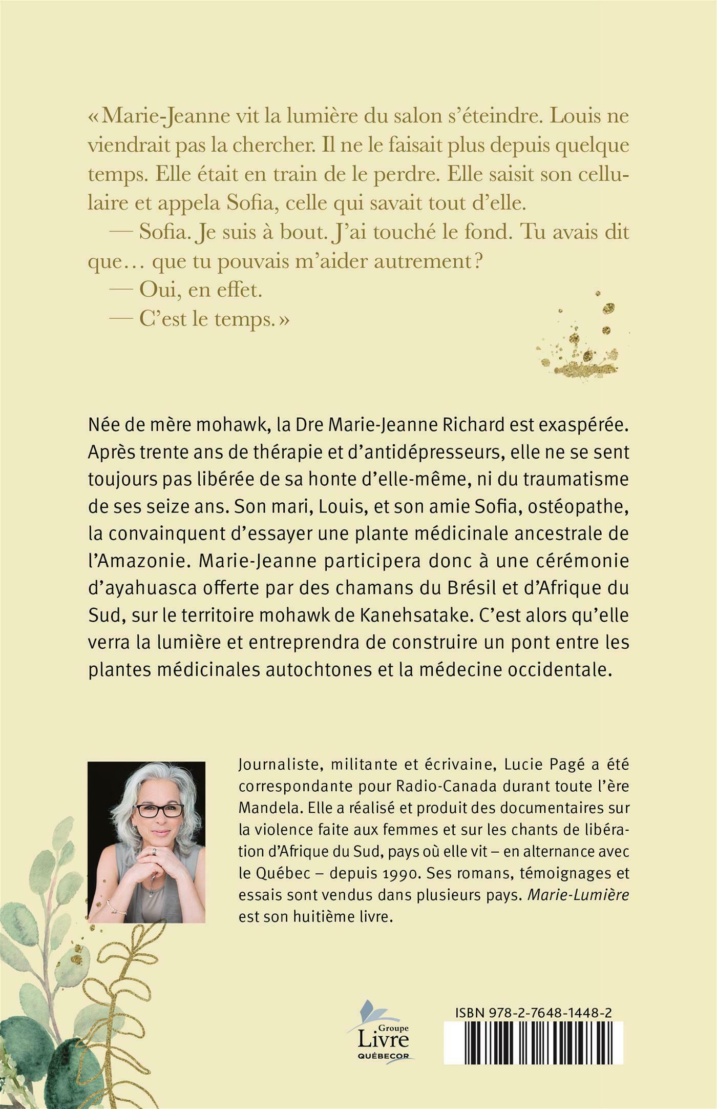 Née de mère mohawk, la Dre Marie-Jeanne Richard est exaspérée. Après trente ans de thérapie et d'antidépresseurs, elle ne se sent toujours pas libérée de sa honte d'elle- même, ni du traumatisme de ses seize ans. Son mari, Louis, et son amie Sofia, ostéopathe, la convainquent d'essayer une plante médicinale ancestrale de l'Amazonie. Marie-Jeanne participera donc à une cérémonie d'ayahuasca offerte par des chamans du Brésil et d'Afrique du Sud, sur le territoire mohawk de Kanehsatake. C'est alors qu'elle verra la lumière et entreprendra de construire un pont entre les plantes médicinales autochtones et la médecine occidentale.
