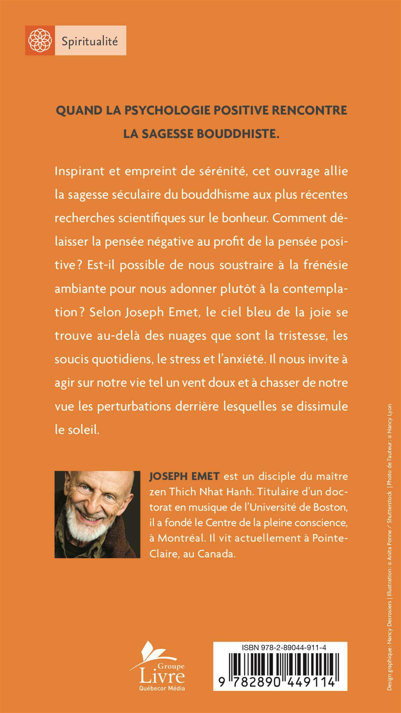.Selon Joseph Emet, le ciel bleu de la joie se trouve au-delà des nuages que sont la tristesse, les soucis quotidiens, le stress et l'anxiété. Il nous invite à agir sur notre vie tel un vent doux et à chasser de notre vue les perturbations derrière lesquelles se dissimule le soleil.