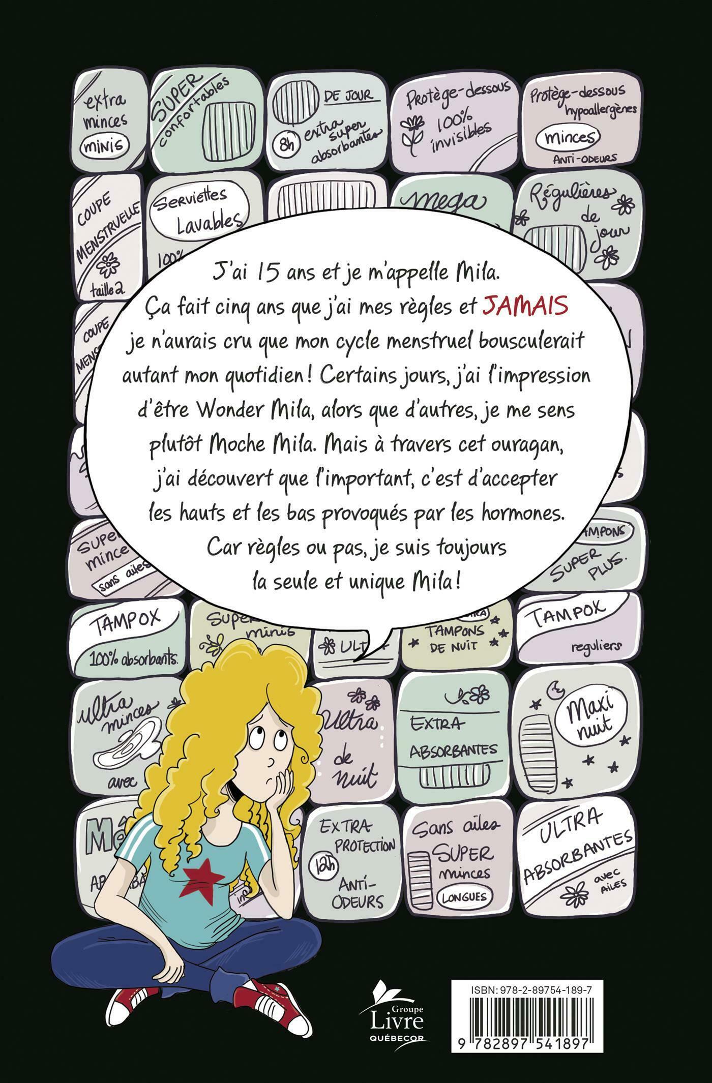 J'ai 15 ans et je m'appelle Mila. Ça fait cinq ans que j'ai mes règles et JAMAIS je n'aurais cru que mon cycle menstruel bousculerait autant mon quotidien! Certains jours, j'ai l'impression d'être Wonder Mila, alors que d'autres, je me sens plutôt Moche Mila. . .Mais à travers cet ouragan, j'ai découvert que l'important, c'est d'accepter les hauts et les bas provoqués par les hormones. Car règles ou pas, je suis toujours la seule et unique Mila!