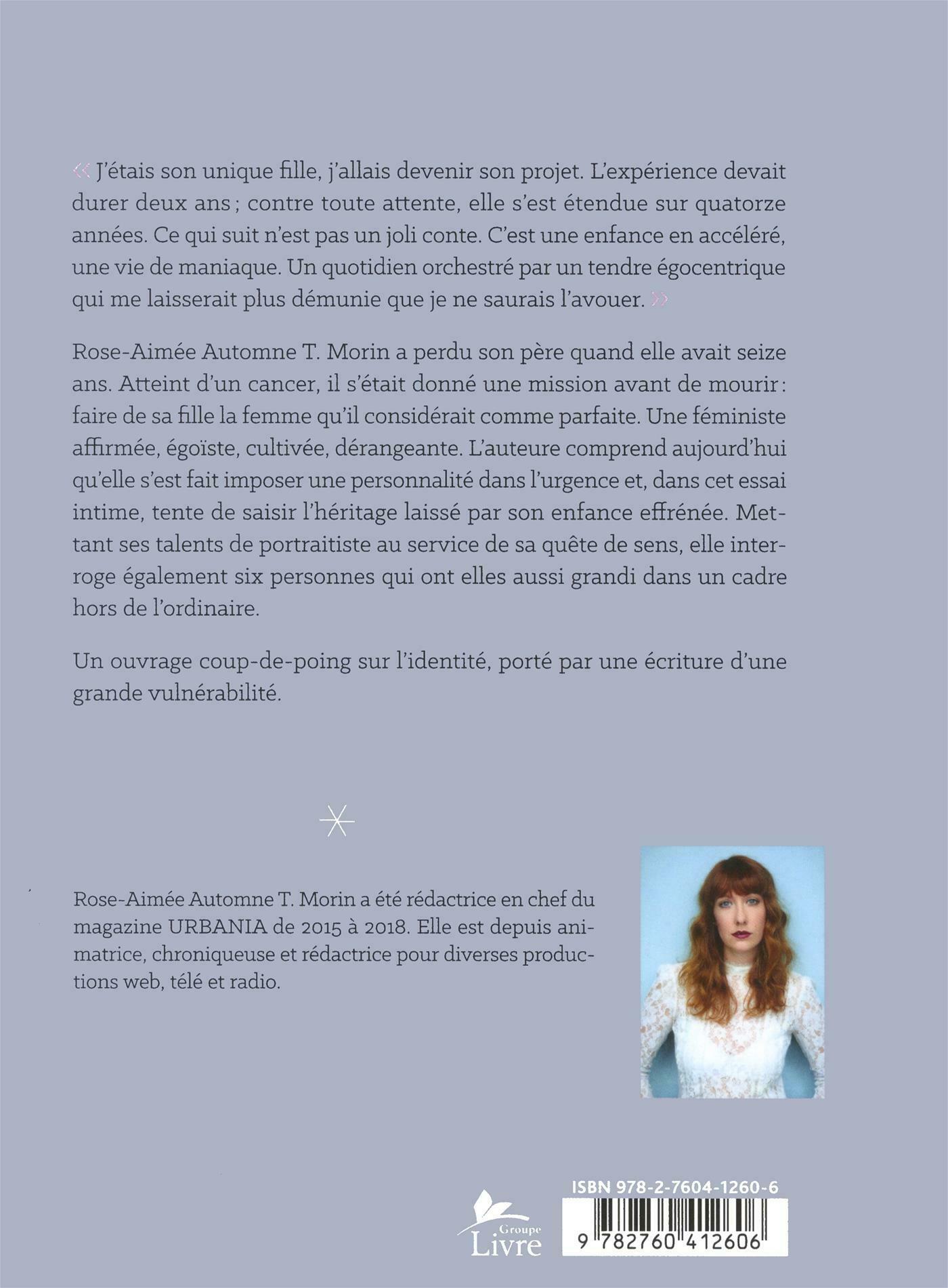 .Rose-Aimée Automne T. Morin a perdu son père quand elle avait seize ans. Atteint d'un cancer, il s'était donné une mission avant de mourir : faire de sa fille la femme qu'il considérait comme parfaite. Une féministe affirmée, égoïste, cultivée, dérangeante. L'auteure comprend aujourd'hui qu'elle s'est fait imposer une personnalité dans l'urgence et, dans cet essai intime, tente de saisir l'héritage laissé par son enfance effrénée. Mettant ses talents de portraitiste au service de sa quête de sens, elle interroge également six personnes qui ont elles aussi grandi dans un cadre hors de l'ordinaire.