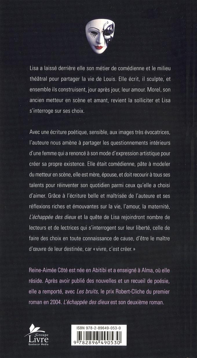 Avec une écriture poétique, sensible, aux images très évocatrices, l’auteure nous amène à partager les questionnements intérieurs d’une femme qui a renoncé à son mode d’expression artistique pour créer sa propre existence. Elle était comédienne, pâte à modeler du metteur en scène, elle est mère, épouse, et doit recourir à tous ses talents pour réinventer son quotidien parmi ceux qu’elle a choisi d’aimer. Grâce à l’écriture belle et maîtrisée de l’auteure et à ses réflexions riches et émouvantes sur la vie, l’amour, la maternité, L’échappée des dieux et la quête de Lisa rejoindront nombre de lecteurs et de lectrices qui s’interrogent sur leur liberté, celle de faire des choix en toute connaissance de cause, d’être le maître d’œuvre de leur destinée, car « vivre, c’est créer ».