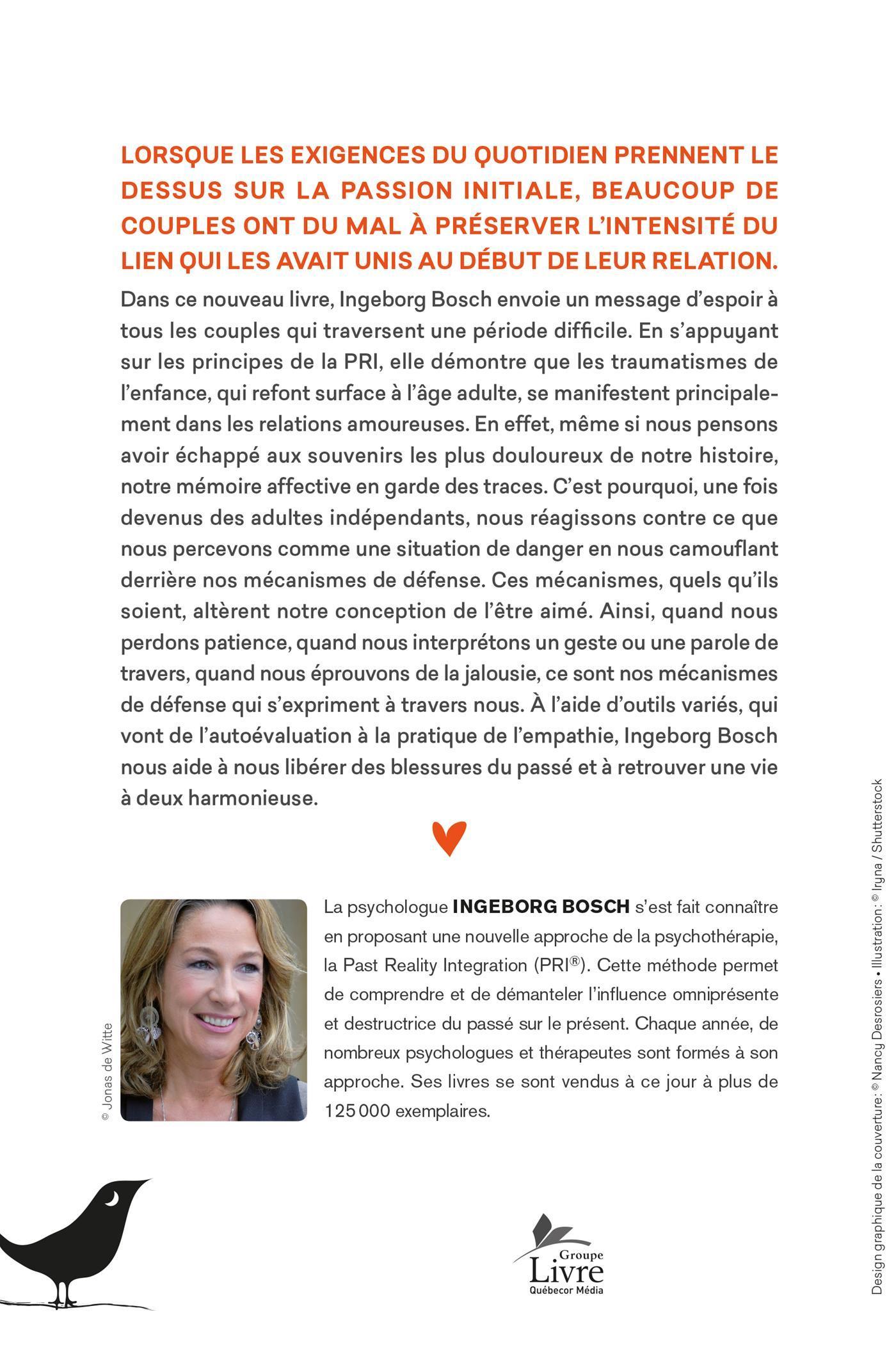Dans ce nouveau livre, Ingeborg Bosch envoie un message d'espoir à tous les couples qui traversent une période difficile. En s'appuyant sur les principes de la PRI, elle démontre que les traumatismes de l'enfance, qui refont surface à l'âge adulte, se manifestent principalement dans les relations amoureuses. En effet, même si nous pensons avoir échappé aux souvenirs les plus douloureux de notre histoire, notre mémoire affective en garde des traces. C'est pourquoi, une fois devenus des adultes indépendants, nous réagissons contre ce que nous percevons comme une situation de danger en nous camouflant derrière nos mécanismes de défense. Ces mécanismes, quels qu'ils soient, altèrent notre conception de l'être aimé. Ainsi, quand nous perdons patience, quand nous interprétons un geste ou une parole de travers, quand nous éprouvons de la jalousie, ce sont nos mécanismes de défense qui s'expriment à travers nous. À l'aide d'outils variés, qui vont de l'autoévaluation à la pratique de l'empathie, Ingeborg Bosch nous aide à nous libérer des blessures du passé et à retrouver une vie à deux harmonieuse.