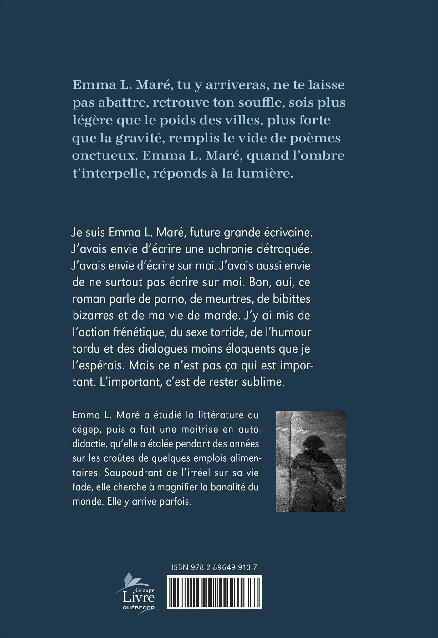 Je suis Emma L. Maré, future grande écrivaine. J'avais envie d'écrire une uchronie détraquée. J'avais envie d'écrire sur moi. J'avais aussi envie de ne surtout pas écrire sur moi. Bon, oui, ce roman parle de porno, de meurtres, de bibittes bizarres et de ma vie de marde. J'y ai mis de l'action frénétique, du sexe torride, de l'humour tordu et des dialogues moins éloquents que je l'espérais. Mais ce n'est pas ça qui est important. L'important, c'est de rester sublime.