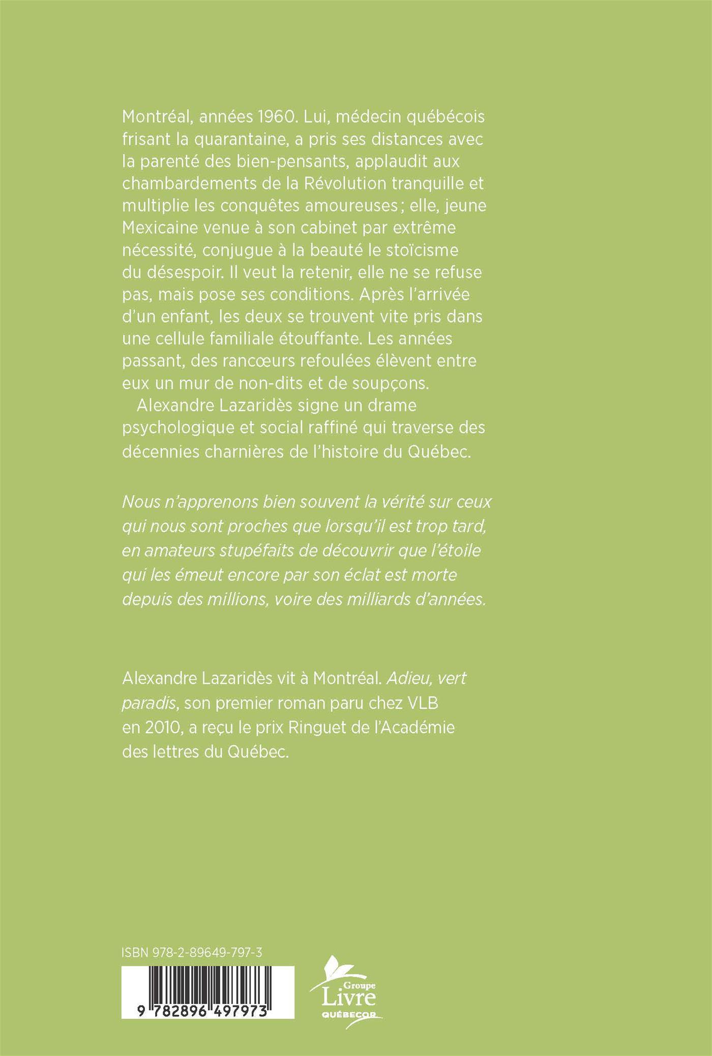 Montréal, années 1960. Lui, médecin québécois frisant la quarantaine, a pris ses distances avec la parenté des bien-pensants,applaudit aux chambardements de la Révolution tranquille et multiplie les conquêtes amoureuses ; elle, jeune Mexicaine venue à son cabinet par extrême nécessité, conjugue à la beauté le stoïcisme du désespoir. Il veut la retenir,elle ne se refuse pas, mais pose ses conditions. Après l'arrivée d'un enfant, les deux se trouvent vite pris dans une cellule familiale étouffante. Les années passant, des rancoeurs refoulées élèvent entre eux un mur de non-dits et de soupçons.