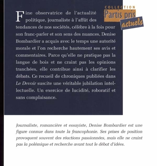 Fine observatrice de l'actualité politique, journaliste à l'affût des tendances de nos sociétés, célèbre à la fois pour son franc-parler et son sens des nuances, Denise Bombardier a acquis avec le temps une autorité morale et l'on recherche hautement ses avis et commentaires. Parce qu'elle ne pratique pas la langue de bois et ne craint pas les opinions tranchées, elle contribue ainsi à clarifier les débats.Ce recueil de chroniques publiées dans Le Devoir suscite une véritable jubilation intellectuelle. Un exercice de lucidité, roboratif et sans complaisance.