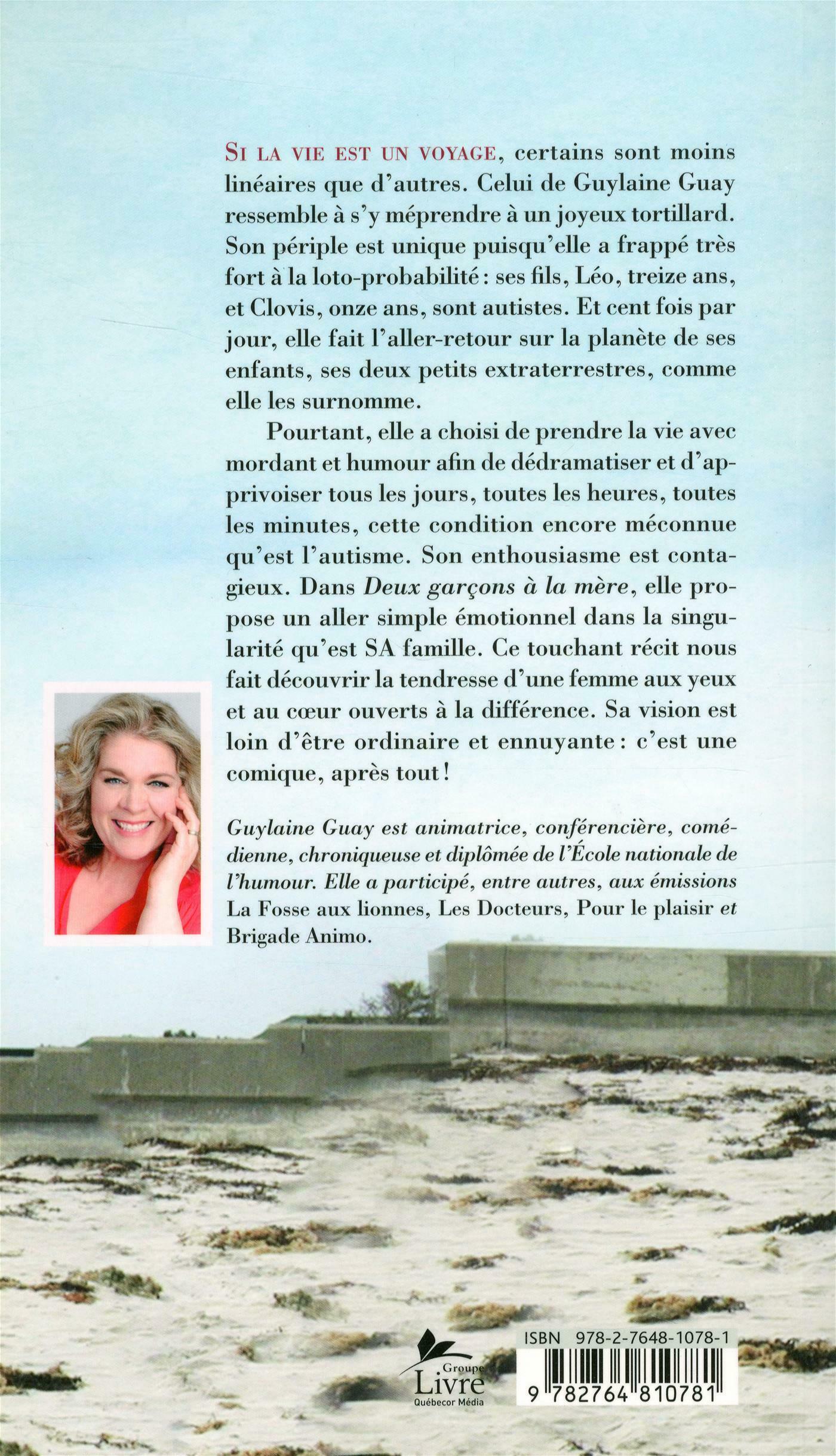 .Pourtant, elle a choisi de prendre la vie avec mordant et humour afin de dédramatiser et d'apprivoiser tous les jours, toutes les heures, toutes les minutes, cette condition encore méconnue qu'est l'autisme. Rien ne semble vouloir l'arrêter ou la démonter. Au contraire, son enthousiasme est contagieux. Dans Deux garçons à la mère, elle propose un aller simple émotionnel dans la singularité qu'est SA famille. Ce touchant récit nous fait découvrir toute la tendresse d'une femme aux yeux et au cœur ouverts à la différence. La vision de Guylaine Guay est loin d'être ordinaire et ennuyante : c'est une comique, après tout !