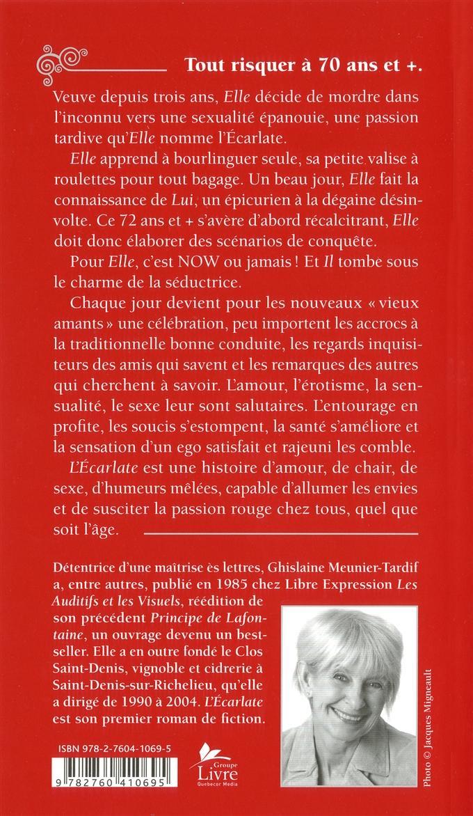 Une histoire de chair, de sexe, d’humeurs mêlées, qui suscite la passion chez tous les seniors de la terre. C’est l’histoire de deux septuagénaires, Lui, entravé par le carcan de la religion, et Elle, veuve autonome, choyée par la vie, bien décidée à mordre dans l’inconnu pour vivre une sexualité épanouie qu’elle nomme l’Écarlate. Tout débute par une rencontre au cours d’une croisière hivernale aux Îles-de-la-Madeleine. Il flirte avec la superbe Elle. Mais le peau contre peau dans la cabine frigorifiée n’aura pas lieu. Terminus, chacun remballe ses fantasmes. Au printemps, Il contacte Elle. S’ensuivent quelques rencontres autour d’un café et des échanges intellectuels. Elle s’énerve : « tolérance zéro ». Elle le veut NOW dans sa couche. De tactiques sensuelles en manoeuvres diverses, Elle parvient à réveiller le volcan assoupi. Au lit, par un bel après-midi d’été, les corps s’entremêlent, les souffles se confondent, les aveux suivent. Un bémol aux jouissances : l’amant est marié et ne veut en rien modifier sa vie.