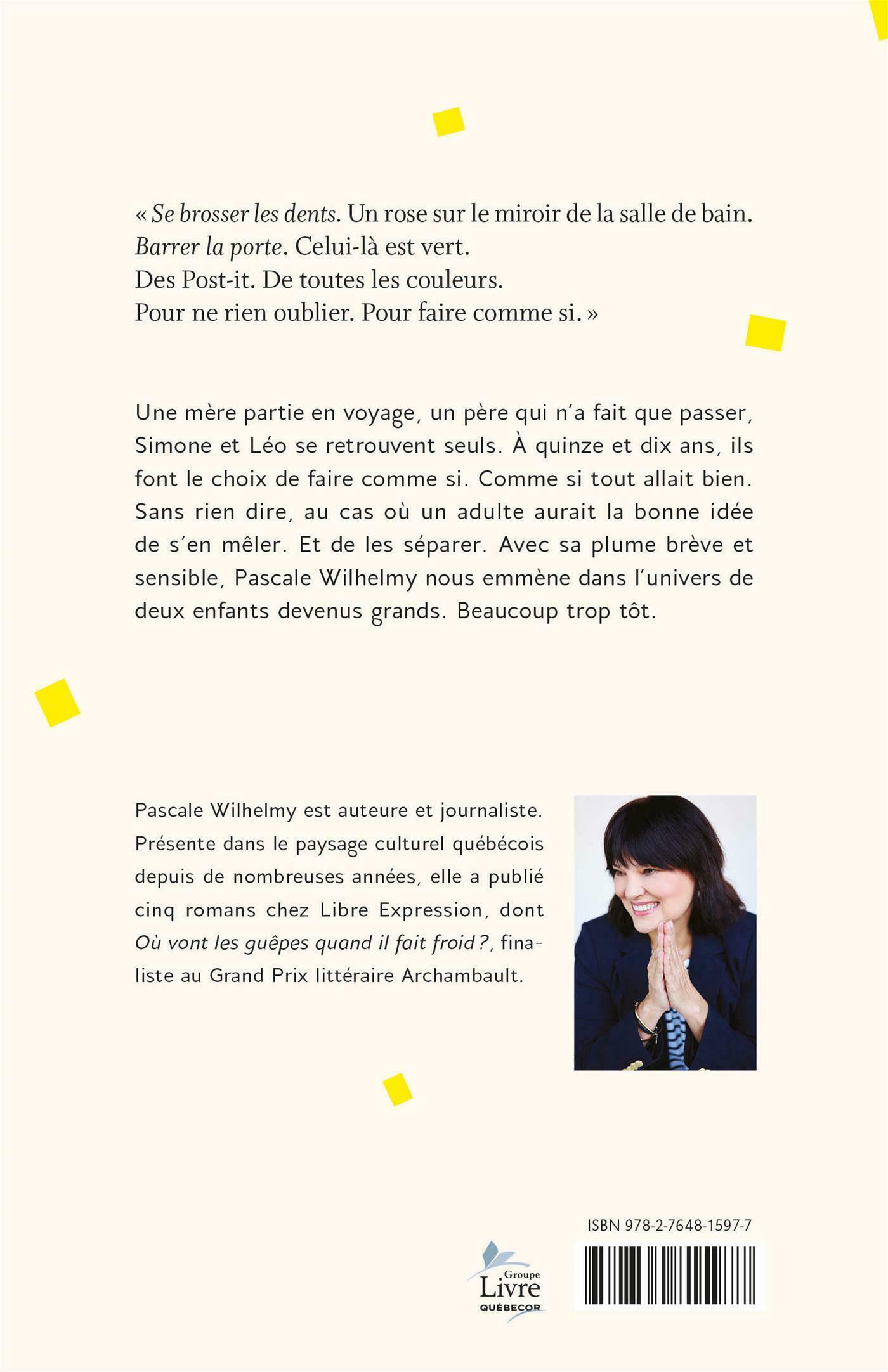 Une mère partie en voyage, un père qui n'a fait que passer, Simone et Léo se retrouvent seuls. À quinze et dix ans, ils font le choix de faire comme si. Comme si tout allait bien. Sans rien dire, au cas où un adulte aurait la bonne idée de s'en mêler. Et de les séparer. Avec sa plume brève et sensible, Pascale Wilhelmy nous emmène dans l'univers de deux enfants devenus grands. Beaucoup trop tôt.