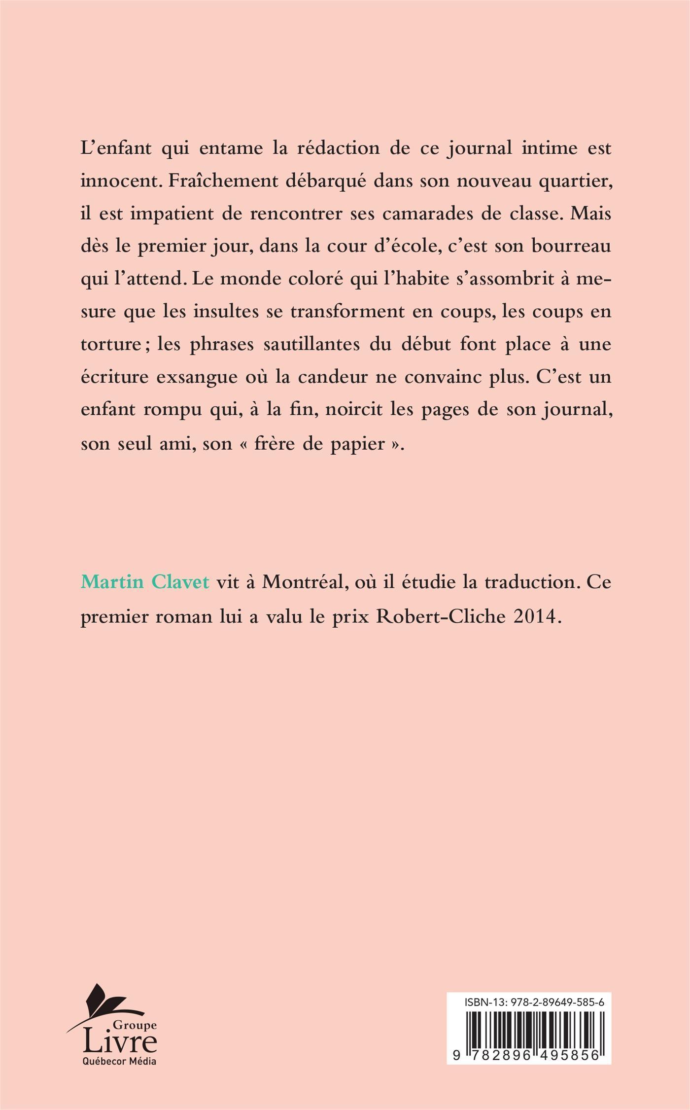 L'enfant qui entame la rédaction de ce journal intime est innocent. Fraîchement débarqué dans son nouveau quartier, il lui tarde de rencontrer ses camarades de classe. Mais dès le premier jour, dans la cour d'école, c'est son bourreau qui l'attend. Le monde coloré qui l'habite s'assombrit à mesure que les insultes se transforment en coups, les coups en torture; les phrases sautillantes du début font place à une écriture exsangue où la candeur ne convainc plus. C'est un enfant rompu qui, à la fin, noircit les pages de son journal, son seul ami, son « frère de papier ».