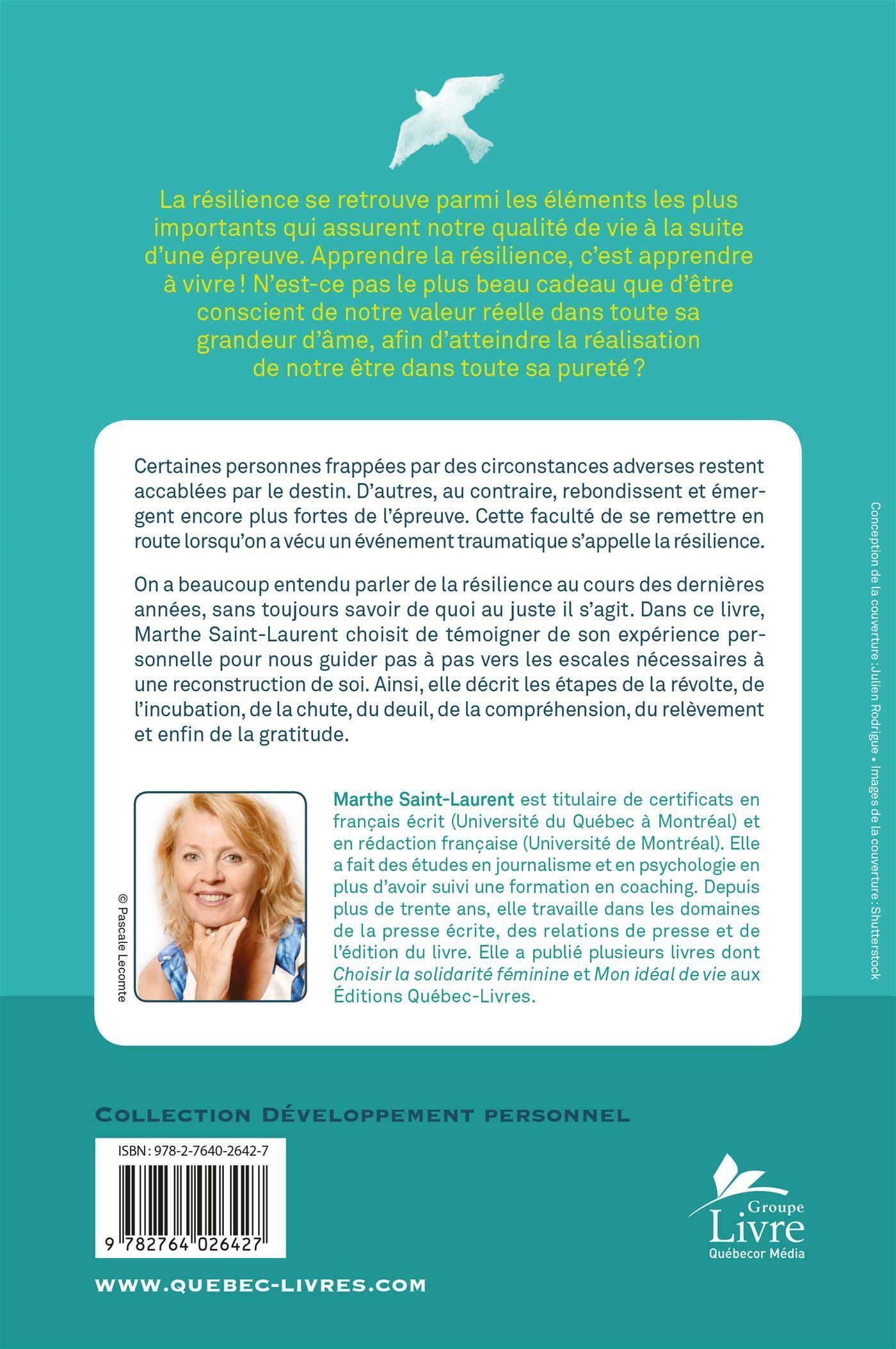 Certaines personnes frappées par des circonstances adverses restent accablées par le destin. D'autres, au contraire, rebondissent et émergent encore plus fortes de l'épreuve. Cette faculté de se remettre en route lorsqu'on a vécu un événement traumatique s'appelle la résilience. On a beaucoup entendu parler de la résilience au cours des dernières années, sans toujours savoir de quoi au juste il s'agit. Dans ce livre, Marthe Saint-Laurent choisit de témoigner de son expérience personnelle pour nous guider pas à pas vers les escales nécessaires à une reconstruction de soi. Ainsi, elle décrit les étapes de la révolte, de l'incubation, de la chute, du deuil, de la compréhension, du relèvement et enfin de la gratitude.