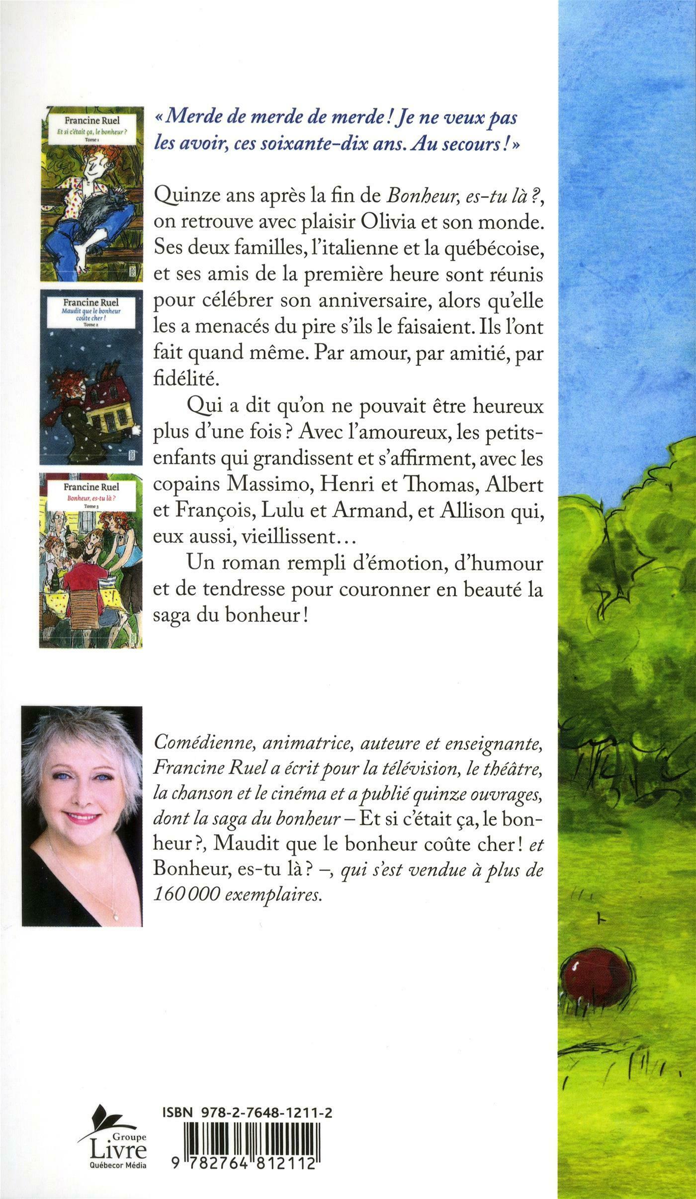 «Merde de merde de merde ! Je ne veux pasles avoir, ces soixante-dix ans. Au secours !» . .Quinze ans après la fin de Bonheur, es-tu là ?, on retrouve avec plaisir Olivia et son monde. Ses deux familles, l'italienne et la québécoise, et ses amis de la première heure sont réunis pour célébrer son anniversaire, alors qu'elle les a menacés du pire s'ils le faisaient. Ils l'ont fait quand même. Par amour, par amitié, par fidélité. . .Qui a dit qu'on ne pouvait être heureux plus d'une fois ? Avec l'amoureux, les petits-enfants qui grandissent et s'affirment, avec les copains Massimo, Henri et Thomas, Albert et François, Lulu et Armand, et Allison qui, eux aussi, vieillissent… . .Un roman rempli d'émotion, d'humour et de tendresse pour couronner en beauté la saga du bonheur !