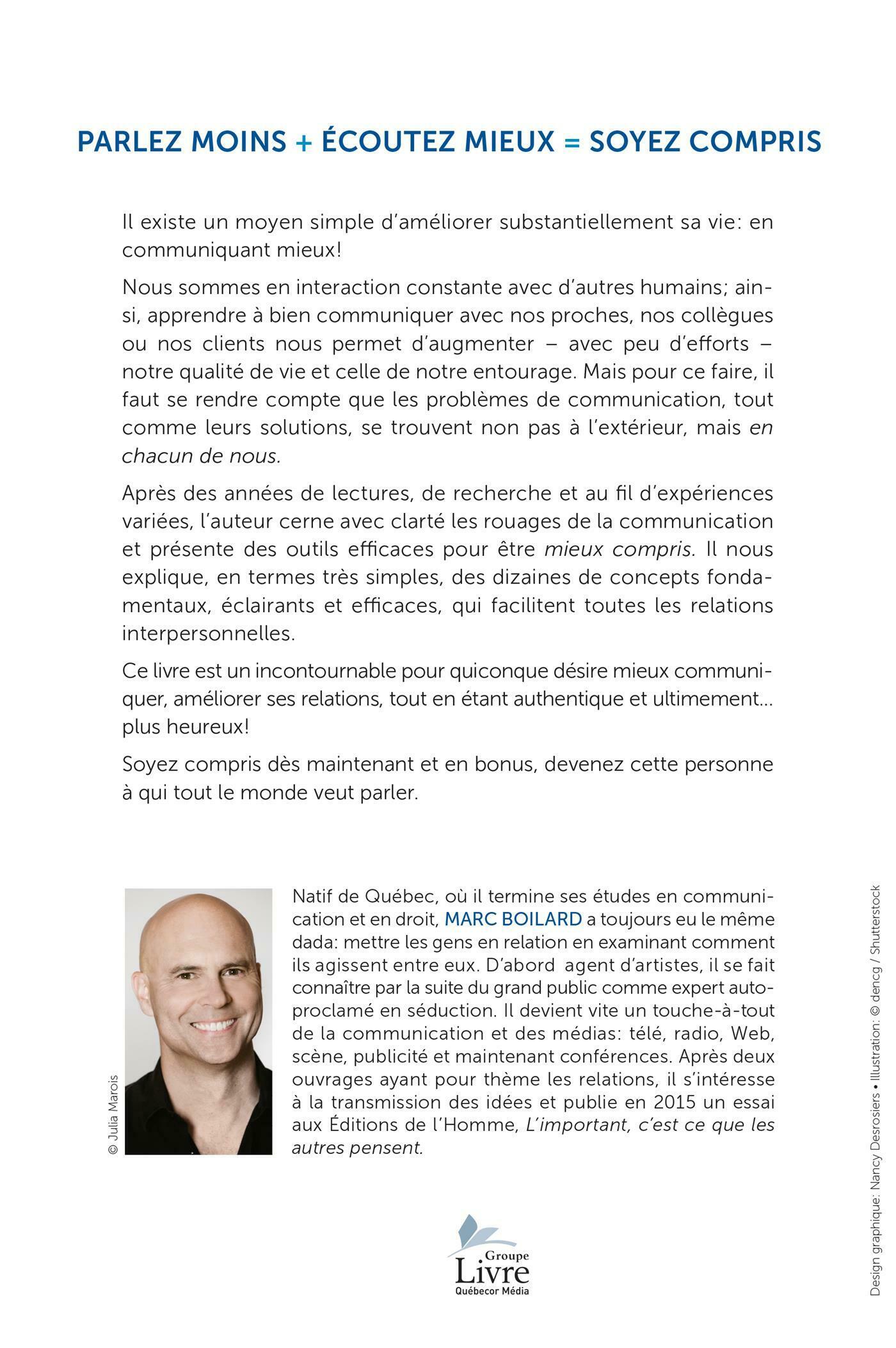 .Après des années de lectures, de recherche et au fil d'expériences variées, l'auteur cerne avec clarté les rouages de la communication et présente des outils efficaces pour être mieux compris. Il nous explique, en termes très simples, des dizaines de concepts fondamentaux, éclairants et efficaces, qui facilitent toutes les relations interpersonnelles. Ce livre est un incontournable pour quiconque désire mieux communiquer, améliorer ses relations, tout en étant authentique et ultimement…plus heureux!
