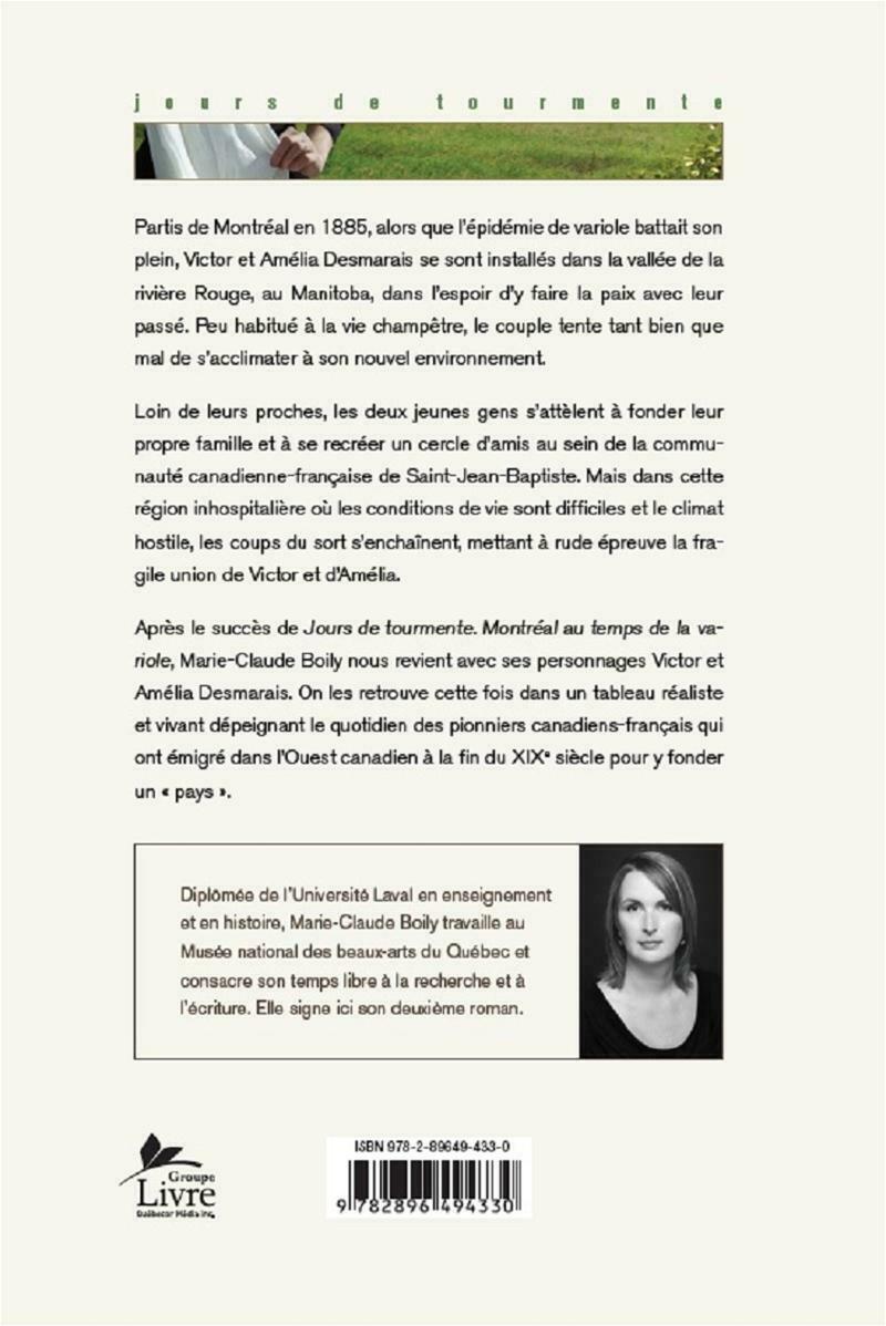 Partis de Montréal en 1885, alors que l'épidémie de variole battait son plein, Victor et Amélia Desmarais se sont installés dans la vallée de la rivière Rouge, au Manitoba, dans l'espoir d'y faire la paix avec leur passé. Peu habitué à la vie champêtre, le couple tente tant bien que mal de s'acclimater à son nouvel environnement. . .Loin de leurs proches, les deux jeunes gens s'attèlent à fonder leur propre famille et à se recréer un cercle d'amis au sein de la communauté canadienne-française de Saint-Jean-Baptiste. Mais dans cette région inhospitalière où les conditions de vie sont difficiles et le climat hostile, les coups du sort s'enchaînent, mettant à rude épreuve la fragile union de Victor et d'Amélia. . .Après le succès de Jours de tourmente. Montréal au temps de la variole, Marie-Claude Boily nous revient avec ses personnages Victor et Amélia Desmarais. On les retrouve cette fois dans un tableau réaliste et vivant dépeignant le quotidien des pionniers canadiens-français qui ont émigré dans l'Ouest canadien à la fin du XIXe siècle pour y fonder un « pays ».