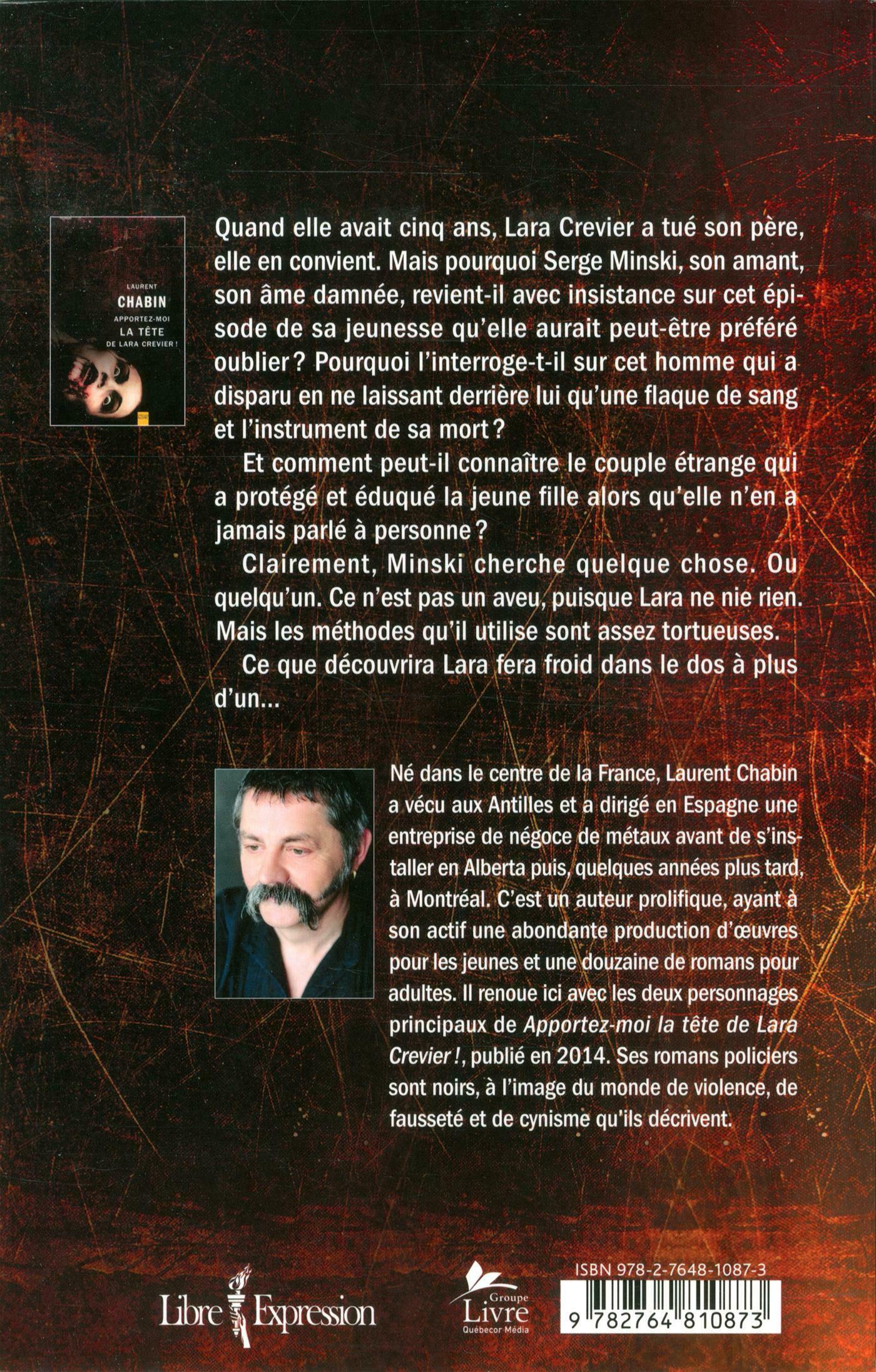 Quand elle avait cinq ans, Lara Crevier a tué son père, elle en convient. Mais pourquoi Serge Minski, son amant, son âme damnée, revient-il avec insistance sur cet épisode de sa jeunesse qu'elle aurait peut-être préféré oublier ? Pourquoi l'interroge-t-il sur cet homme qui a disparu en ne laissant derrière lui qu'une flaque de sang et l'instrument de sa mort ? . .Et comment peut-il connaître le couple étrange qui a protégé et éduqué la jeune fille alors qu'elle n'en a jamais parlé à personne ? . .Clairement, Minski cherche quelque chose. Ou quelqu'un. Ce n'est pas un aveu, puisque Lara ne nie rien. Mais les méthodes qu'il utilise sont assez tortueuses. . .Ce que découvrira Lara fera froid dans le dos à plus d'un…