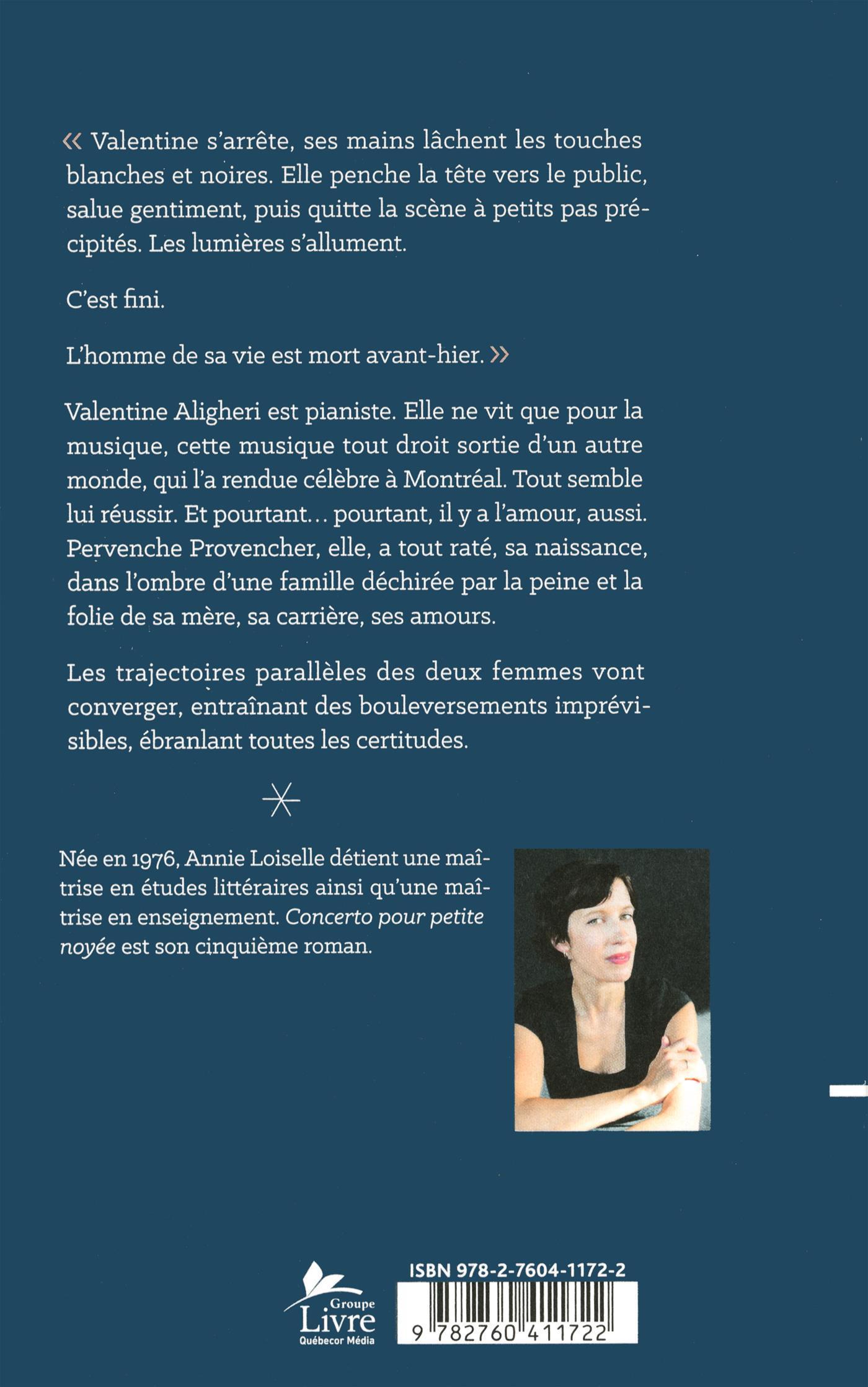 Valentine Aligheri est pianiste. Elle ne vit que pour la musique, cette musique tout droit sortie d'un autre monde, qui l'a rendue célèbre à Montréal. Tout semble lui réussir. Et pourtant… pourtant, il y a l'amour, aussi. Pervenche Provencher, elle, a tout raté, sa naissance, dans l'ombre d'une famille déchirée par la peine et la folie de sa mère, sa carrière, ses amours.