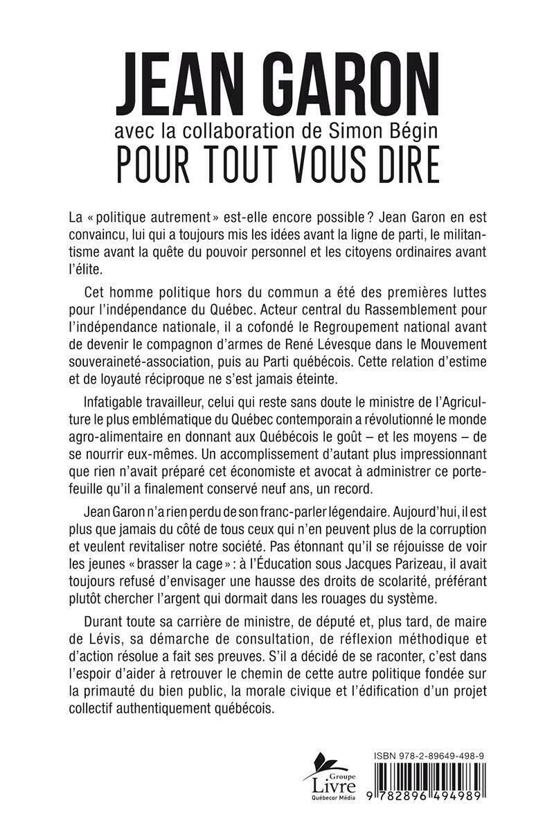 .Jean Garon n'a rien perdu de son franc-parler légendaire. Aujourd'hui, il est plus que jamais du côté de tous ceux qui n'en peuvent plus de la corruption et veulent revitaliser notre société. Pas étonnant qu'il se réjouisse de voir les jeunes « brasser la cage » : à l'Éducation sous Jacques Parizeau, il avait toujours refusé d'envisager une hausse des droits de scolarité, préférant plutôt chercher l'argent qui dormait dans les rouages du système.