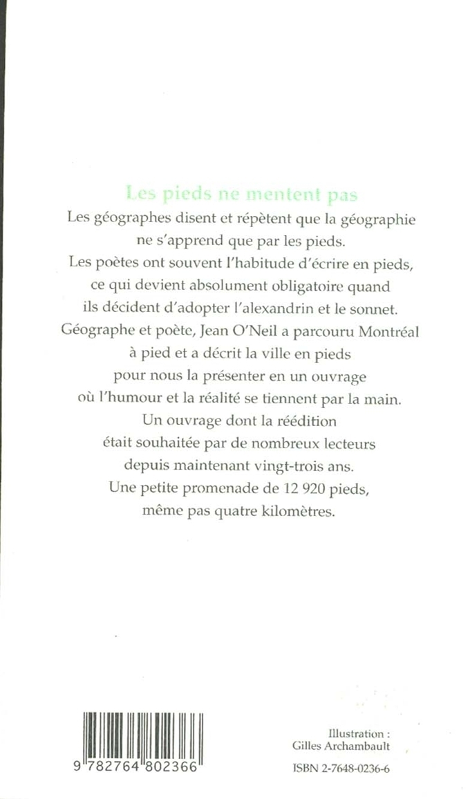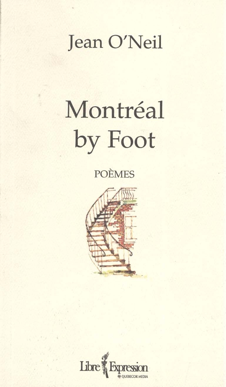 Publié à l’automne de 1983 aux Éditions du Ginkgo, Montréal by Foot est un univers, le sonnet est un jeu, et le jeu, une façon d’affronter l’univers, de le fixer pour un instant dans sa course. La Charte de la langue française du Québec avait six ans, mais les façades montréalaises avaient encore – comme elles l’ont toujours – un visage franglais à la Monsieur Muffler, d’où le titre du recueil lui-même et de tous les poèmes qui, toutefois, respectent les plus strictes règles de la versification française. Bien sûr que Montréal a son accent aigu, comme il se doit, mais pourquoi by Foot ? Parce que Jean O’Neil avait marché dans la ville de long en large, à pied, cela va de soi, et parce qu’il la décrivait également en pieds, à coups de douze plus précisément, comme tout alexandrin qui se respecte. Des alexandrins, il y en a 1044 dans ce recueil, pour un total de 12 528 pieds; et comme deux poèmes sont en octosyllabes avec 392 pieds de plus, on en arrive à 12 920 pieds,une toute petite promenade pour une aussi grande ville.