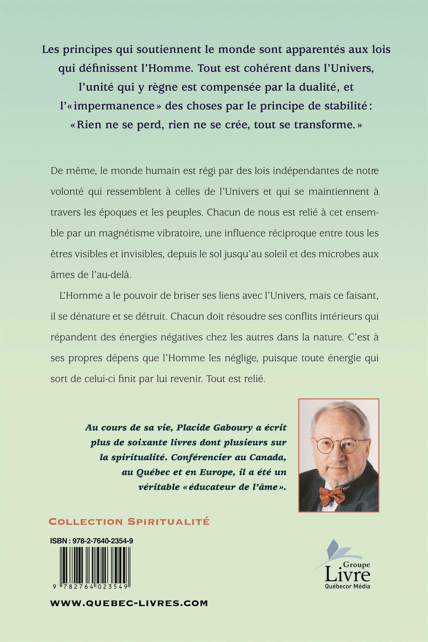 Les principes qui soutiennent le monde sont apparentés aux lois qui définissent l'Homme. Tout est cohérent dans l'Univers, l'unité qui y règne est compensée par la dualité, et l'«impermanence»des choses par le principe de stabilité: «Rien ne se perd, rien ne se crée, tout se transforme.» De même, le monde humain est régi par des lois indépendantes de notre volonté qui ressemblent à celles de l'Univers et qui se maintiennent à travers les époques et les peuples. Chacun de nous est relié à cet ensemble par un magnétisme vibratoire, une influence réciproque entre tous les êtres visibles et invisibles, depuis le sol jusqu'au soleil et des microbes aux âmes de l'au-delà. L'Homme a le pouvoir de briser ses liens avec l'Univers, mais ce faisant, il se dénature et se détruit. Chacun doit résoudre ses conflits intérieurs qui répandent des énergies négatives chez les autres dans la nature. C'est à ses propres dépens que l'Homme les néglige, puisque toute énergie qui sort de celui-ci finit par lui revenir. Tout est relié. Au cours de sa vie, Placide Gaboury a écrit plus de soixante livres dont plusieurs sur la spiritualité. Conférencier au Canada, au Québec et en Europe, il a été un véritable « éducateur de l'âme ».