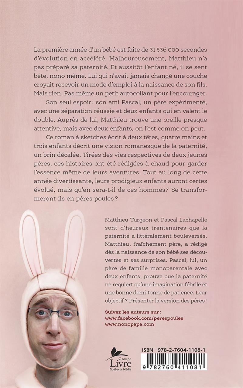 La première année d'un bébé est faite de 31536000 secondes d'évolution en accéléré. Malheureusement, Matthieu n'a pas préparé sa paternité. Et aussitôt l'enfant né, il se sent bête, nono même. Lui qui n'avait jamais changé une couche croyait recevoir un mode d'emploi à la naissance de son fils. Mais rien. Pas même un petit autocollant pour l'encourager. Son seul espoir : son ami Pascal, un père expérimenté, avec une séparation réussie et deux enfants qui en valent le double. Auprès de lui, Matthieu trouve une oreille presque attentive, mais avec deux enfants, on l'est comme on peut. Ce roman à sketches écrit à deux têtes, quatre mains et trois enfants décrit une vision romanesque de la paternité, un brin décalée. Tirées des vies respectives de deux jeunes pères, ces histoires ont été rédigées à chaud pour garder l'essence même de leurs aventures. Tout au long de cette année divertissante, leurs prodigieux enfants auront certes évolué, mais qu'en sera-t-il de ces hommes? Se transformeront-ils en pères poules ?
