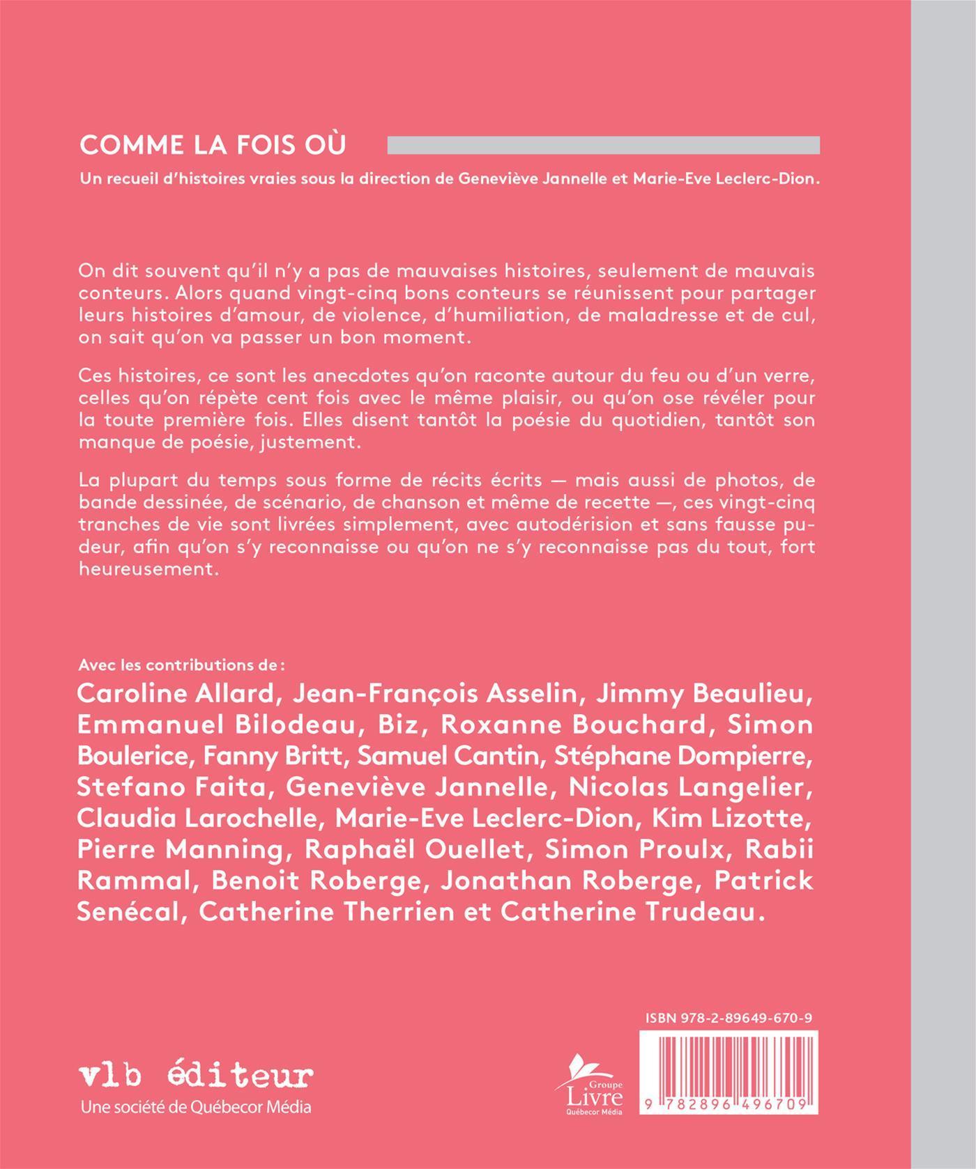 Avec les contributions de : Caroline Allard • Jean-François Asselin • Jimmy Beaulieu • Emmanuel Bilodeau • Biz • Roxanne Bouchard • Simon Boulerice • Fanny Britt • Samuel Cantin • Stéphane Dompierre • Stefano Faita • Geneviève Jannelle • Nicolas Langelier • Claudia Larochelle • Marie-Eve Leclerc-Dion • Kim Lizotte • Pierre Manning • Raphaël Ouellet • Simon Proulx • Rabii Rammal • Benoit Roberge • Jonathan Roberge • Patrick Senécal • Catherine Therrien • Catherine Trudeau.