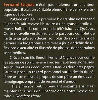 Fernand Gignac n'était pas seulement un chanteur populaire, il était un véritable phénomène de la vie artistique québécoise. Publiée en 1992, la première biographie de Fernand Gignac faisait revivre l'histoire d'une grande étoile du music-hall, de la radio et de la télévision au Québec. Cette nouvelle version relate le parcours complet de l'artiste jusqu'à son décès, soit plus de soixante ans de carrière. La biographie a été mise à jour, enrichie de réflexions d'actualité et illustrée de photos, dont certaines sont inédites.
