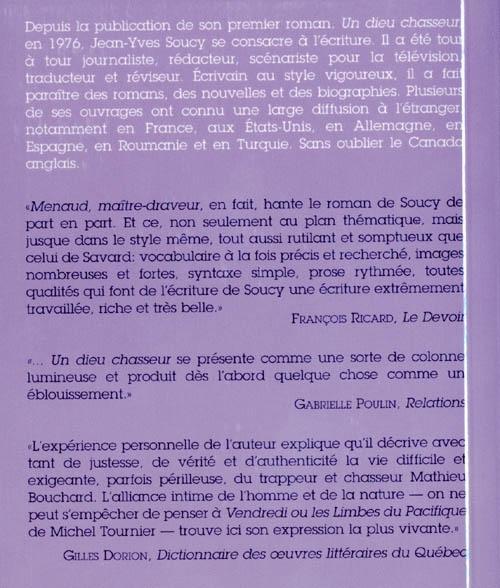 Un dieu chasseur raconte les amours d'un trappeur des «pays d'en haut» avec l'institutrice d'un village voisin de Mont-Laurier. Dans une langue charnue et juteuse, l'auteur narre la vie quotidienne du trappeur, Mathieu, seul mais non solitaire, à la vérité solidaire de ses chiens fidèles, des animaux sauvages, de la forêt giboyeuse, de la nature rude, mais aussi tendre et accueillante.[...] -Gilles Dorion, Québec français